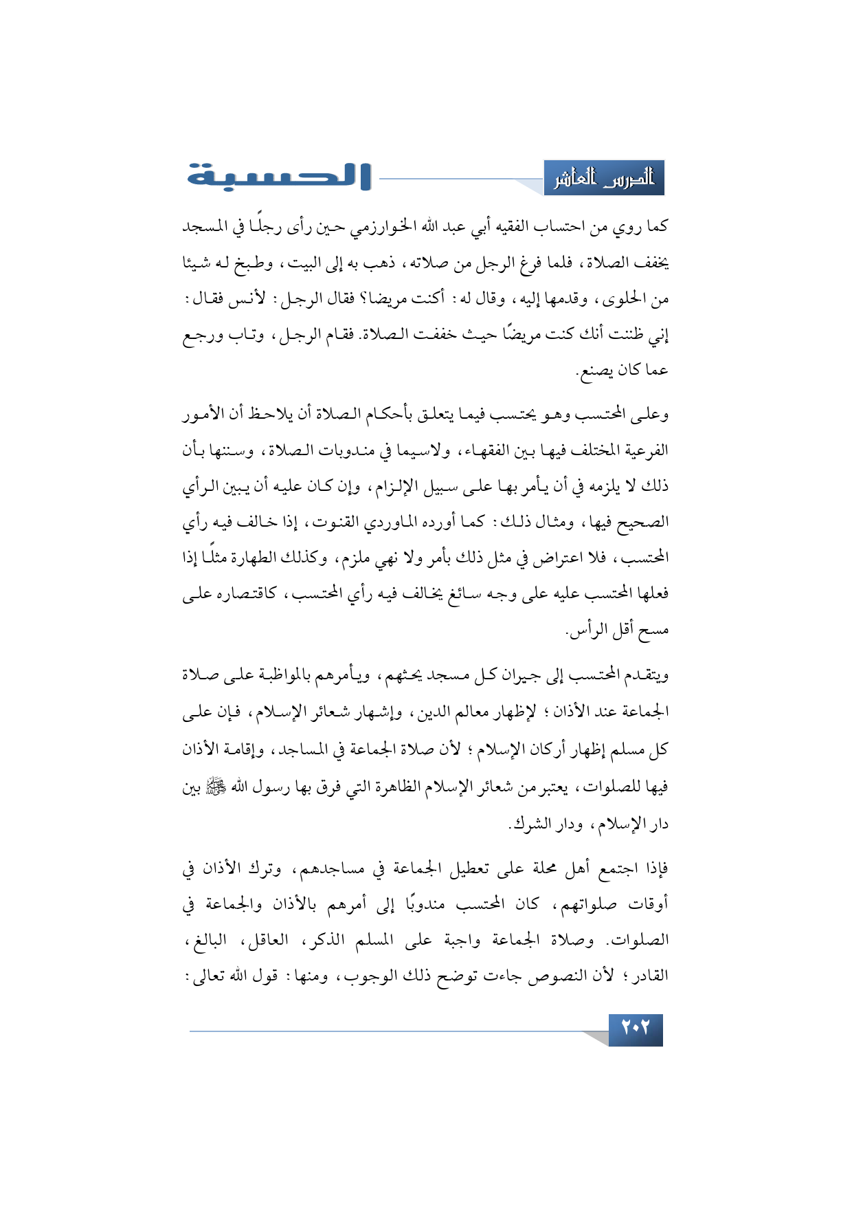 وعلى المحتسب وهو يحتسب فيما يتعلق بأحكام الصلاة أن يلاحظ أن الأمور الفرعية المختلف فيها بين الفقهاء، ولا سيما في مندوبات الصلاة، وسننها بأن ذلك لا يلزمه في أن يأمر بها على سبيل الإلزام، وإن كان عليه أن يبين الرأي الصحيح فيها، ومثال ذلك: كما أورده الماوردي القنوت، إذا خالف فيه رأي المحتسب، فلا اعتراض في مثل ذلك بأمر ولا نهي ملزم، وكذلك الطهارة مثلًا إذا فعلها المحتسب عليه على وجه سائغ يخالف فيه رأي المحتسب، كاقتصاره على مسح أقل الرأس.