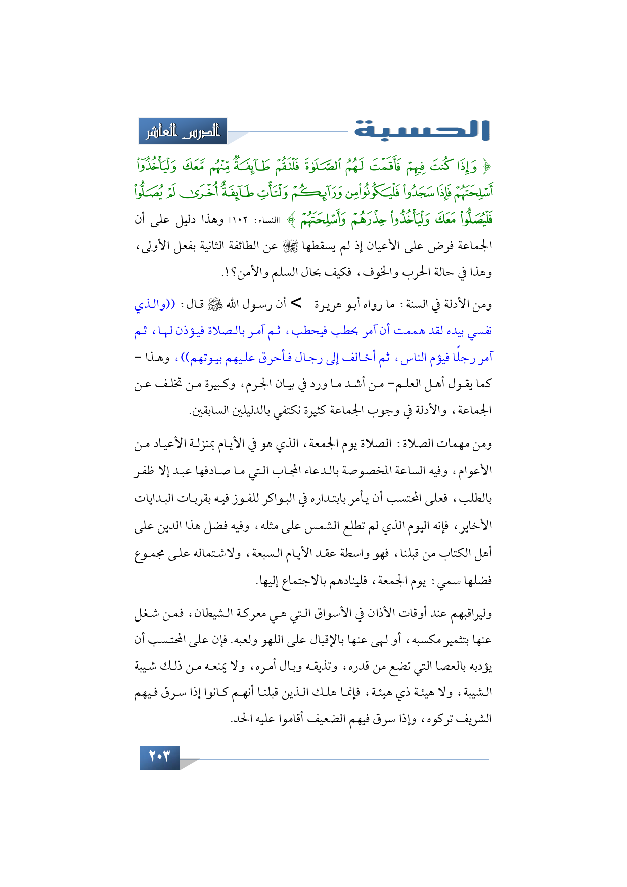وليراقبهم عند أوقات الأذان في الأسواق التي هي معركة الشيطان، فمن شغل عنها بتثمير مكسبه، أو لهى عنها بالإقبال على اللهو ولعبه. فإن على المحتسب أن يؤدبه بالعصا التي تضع من قدره، وتذيقه وبال أمره، ولا يمنعه من ذلك شيبة الشيبة، ولا هيئة ذي هيئة، فإنما هلك الذين قبلنا أنهم كانوا إذا سرق فيهم الشريف تركوه، وإذا سرق فيهم الضعيف أقاموا عليه الحد.