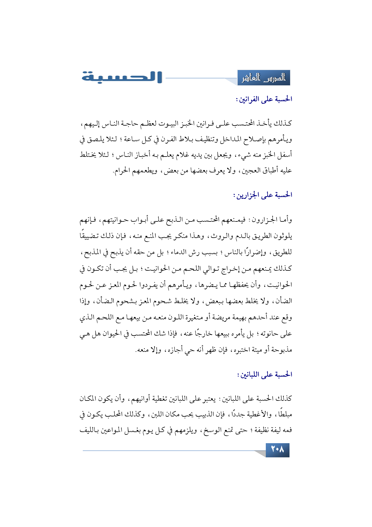 كذلك يأخذ المحتسب على فرانين الخبز البيوت لعظم حاجة الناس إليهم، ويأمرهم بإصلاح المداخل وتنظيف بلاط الفرن في كل ساعة؛ لئلا يلصق في أسفل الخبز منه شيء، ويجعل بين يديه غلام يعلم به أخباز الناس؛ لئلا يختلط عليه أطباق العجين، ولا يعرف بعضها من بعض، ويطعمهم الحرام.