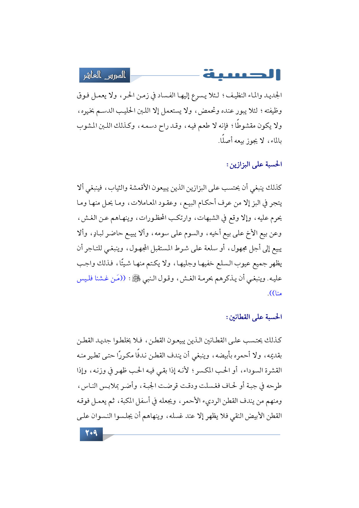 كذلك ينبغي أن يحتسب على البزازين الذين يبيعون الأقمشة والثياب، فينبغي ألا يتجر في البز إلا من عرف أحكام البيع، وعقود المعاملات، وما يحل منها وما يحرم عليه، وإلا وقع في الشبهات، وارتكب المحظورات، وينهاهم عن الغش، وعن بيع الأخ على بيع أخيه، والسوم على سومه، وألا يبيع حاضر لبادٍ، وألا يبيع إلى أجل مجهول، أو سلعة على شرط المستقبل المجهول، وينبغي للتاجر أن يظهر جميع عيوب السلع خفيها وجليها، ولا يكتم منها شيئًا، فذلك واجب عليه. وينبغي أن يذكرهم بحرمة الغش، وقول النبي -صلى الله عليه وسلم-: ((مَن غشنا فليس منا)).