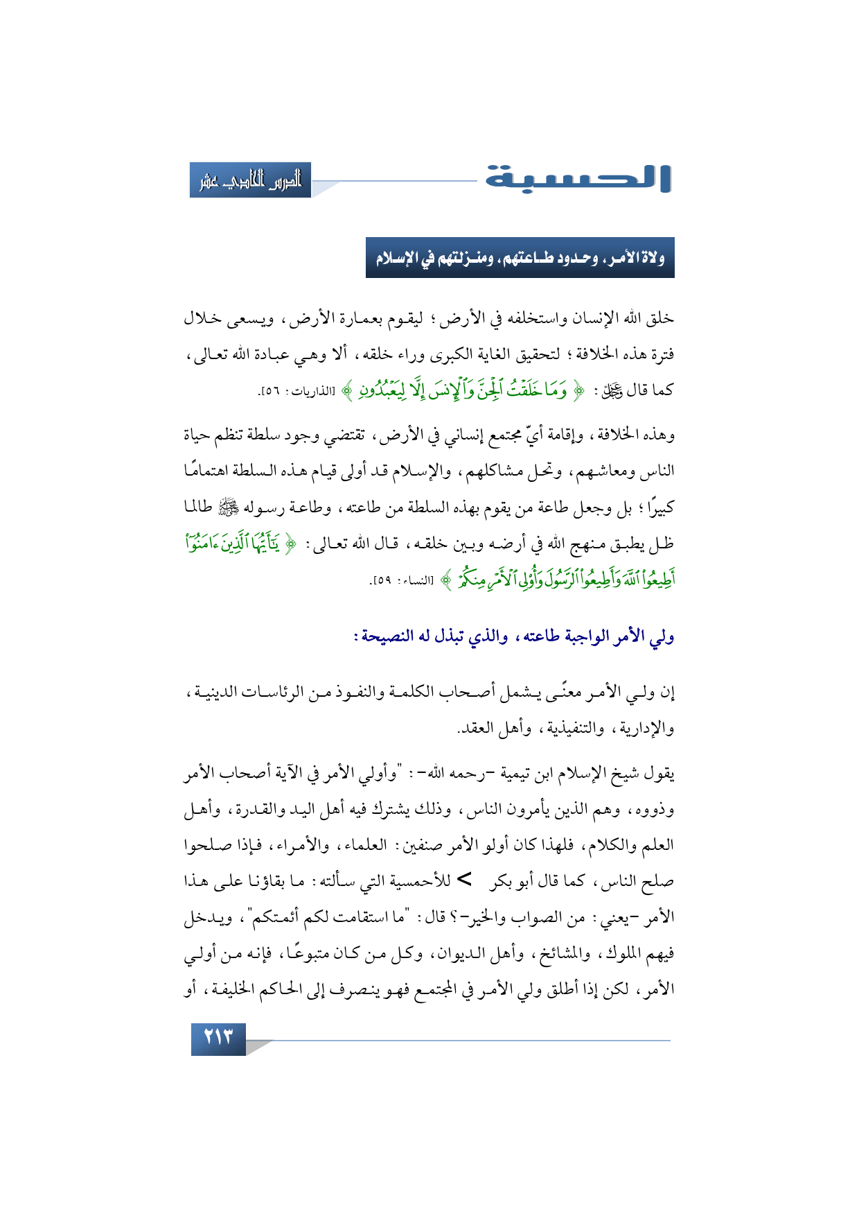 وهذه الخلافة وإقامة أي مجتمع إنساني في الأرض تقتضي وجود سلطة تنظم حياة الناس ومعاشهم، وتحل مشاكلهم، والإسلام قد أولى قيام هذه السلطة اهتمامًا كبيرًا، بل وجعل طاعة من يقوم بهذه السلطة من طاعته وطاعة رسوله -صلى الله عليه وسلم- طالما ظل يطبق منهج الله في أرضه وبين خلقه، قال الله تعالى: {يَا أَيُّهَا الَّذِينَ آمَنُوا أَطِيعُوا اللَّهَ وَأَطِيعُوا الرَّسُولَ وَأُولِي الْأَمْرِ مِنْكُمْ} (النساء: 59)، فمن هو ولي الأمر الواجبة طاعته والذي تبذل له النصيحة؟ إن ولي الأمر معنًى يشمل أصحاب الكلمة والنفوذ من الرئاسات الدينية، والإدارية، والتنفيذية، وأهل العقد.
