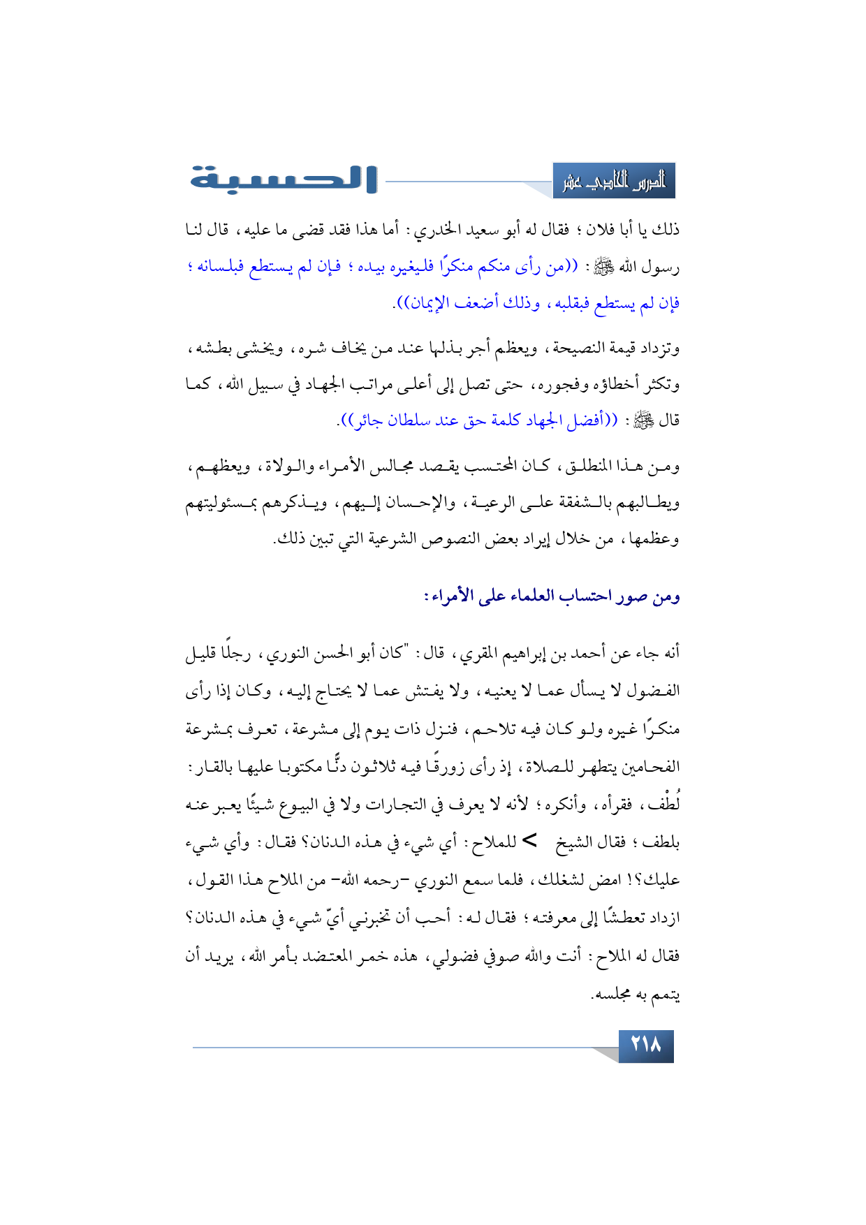 ومن صور احتساب العلماء على الأمراء: أنه جاء عن أحمد بن إبراهيم المقري قال: "كان أبو الحسن النوري رجلًا قليل الفضول لا يسأل عما لا يعنيه، ولا يفتش عما لا يحتاج إليه، وكان إذا رأى منكرًا غيره ولو كان فيه تلاحم، فنزل ذات يوم إلى مشرعة تعرف بمشرعة الفحامين يتطهر للصلاة إذ رأى زورقًا فيه ثلاثون دنًّا مكتوبا عليها بالقار: لُطْف، فقرأه، وأنكره؛ لأنه لا يعرف في التجارات ولا في البيوع شيئًا يعبر عنه بلطف؛ فقال الشيخ -رضي الله عنه- للملاح: أي شيء في هذه الدنان؟ فقال: وأي شيء عليك؟! امض لشغلك، فلما سمع النوري -رحمه الله- من الملاح هذا القول ازداد تعطشًا إلى معرفته؛ فقال له: أحب أن تخبرني أي شيء في هذه الدنان؟ فقال له الملاح: أنت والله صوفي فضولي، هذه خمر المعتضد بأمر الله يريد أن يتمم به مجلسه.