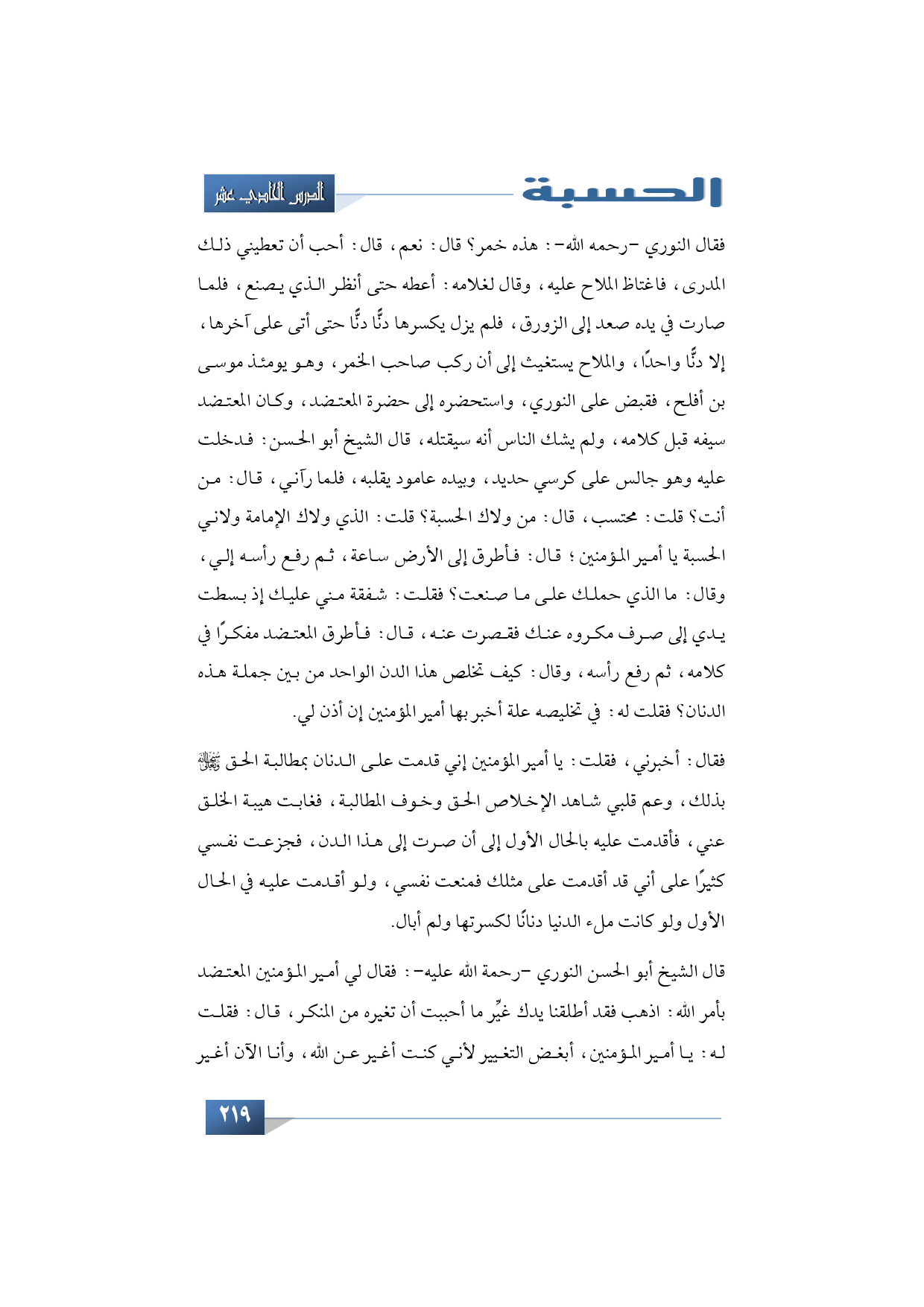 فقال النوري -رحمة الله عليه-: هذه خمر؟ قال: نعم، قال: أحب أن تعطيني ذلك المدرى، فاغتاظ الملاح عليه، وقال لغلامه: أعطه حتى أنظر الذي يصنع، فلما صارت في يده صعد إلى الزورق، فلم يزل يكسرها دنًّا دنًّا حتى أتى على آخرها إلا دنًّا واحدًا، والملاح يستغيث إلى أن ركب صاحب الخمر، وهو يومئذ موسى بن أفلح، فقبض على النوري، واستحضره إلى حضرة المعتضد، وكان المعتضد سيفه قبل كلامه، ولم يشك الناس أنه سيقتله، قال الشيخ أبو الحسن: فدخلت عليه وهو جالس على كرسي حديد، وبيده عامود يقلبه، فلما رآني قال: من أنت؟ قلت: محتسب، قال: من ولاك الحسبة؟ قلت: الذي ولاك الإمامة ولاني الحسبة يا أمير المؤمنين؛ قال: فأطرق إلى الأرض ساعة، ثم رفع رأسه إلي وقال: ما الذي حملك على ما صنعت؟ فقلت: شفقة مني عليك إذ بسطت يدي إلى صرف مكروه عنك فقصرت عنه، قال: فأطرق المعتضد مفكرًا في كلامه، ثم رفع رأسه وقال: كيف تخلص هذا الدن الواحد من بين جملة هذه الدنان؟ فقلت له: في تخليصه علة أخبر بها أمير المؤمنين إن أذن لي.