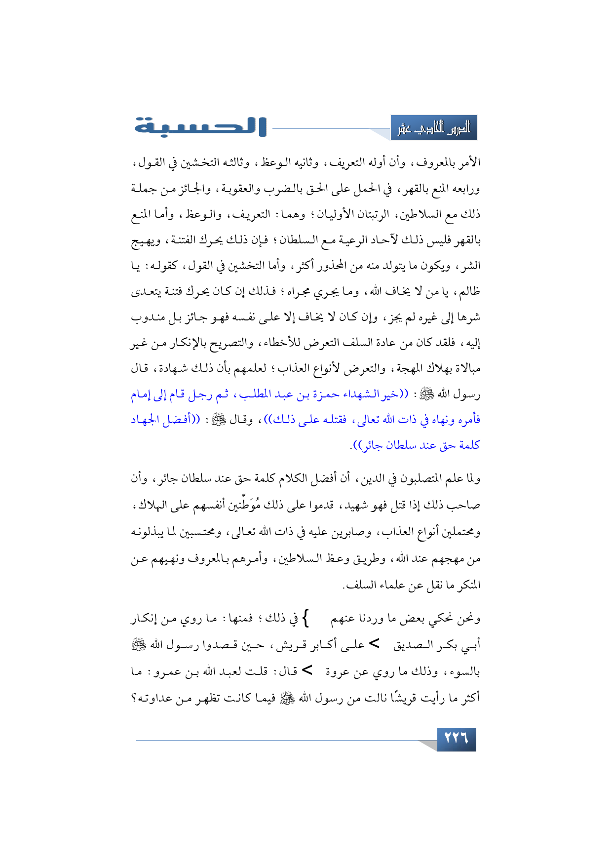 الأمر بالمعروف، وأن أوله التعريف، وثانيه الوعظ، وثالثه التخشين في القول، ورابعه المنع بالقهر في الحمل على الحق بالضرب والعقوبة، والجائز من جملة ذلك مع السلاطين الرتبتان الأوليان، وهما: التعريف، والوعظ، وأما المنع بالقهر فليس ذلك لآحاد الرعية مع السلطان؛ فإن ذلك يحرك الفتنة، ويهيج الشر، ويكون ما يتولد منه من المحذور أكثر، وأما التخشين في القول كقوله: يا ظالم، يا من لا يخاف الله، وما يجري مجراه؛ فذلك إن كان يحرك فتنة يتعدى شرها إلى غيره لم يجز، وإن كان لا يخاف إلا على نفسه فهو جائز بل مندوب إليه، فلقد كان من عادة السلف التعرض للأخطاء، والتصريح بالإنكار من غير مبالاة بهلاك المهجة، والتعرض لأنواع العذاب، لعلمهم بأن ذلك شهادة، قال رسول الله -صلى الله عليه وسلم-: ((خير الشهداء حمزة بن عبد المطلب، ثم رجل قام إلى إمام فأمره ونهاه في ذات الله تعالى فقتله على ذلك))، وقال -صلى الله عليه وسلم-: ((أفضل الجهاد كلمة حق عند سلطان جائر)).
