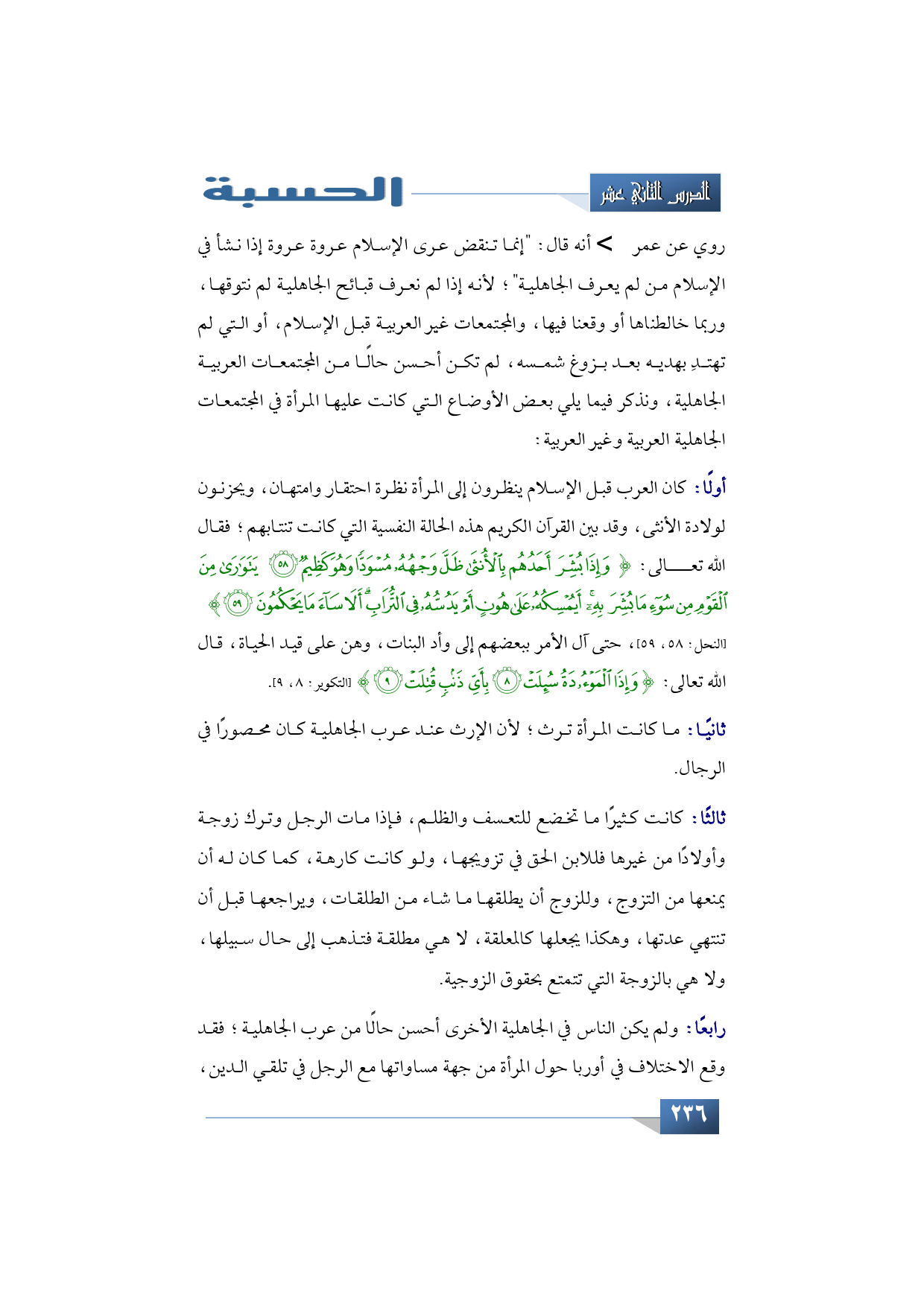 ثانيًا: ما كانت المرأة ترث؛ لأن الإرث عند عرب الجاهلية كان محصورًا في الرجال.
