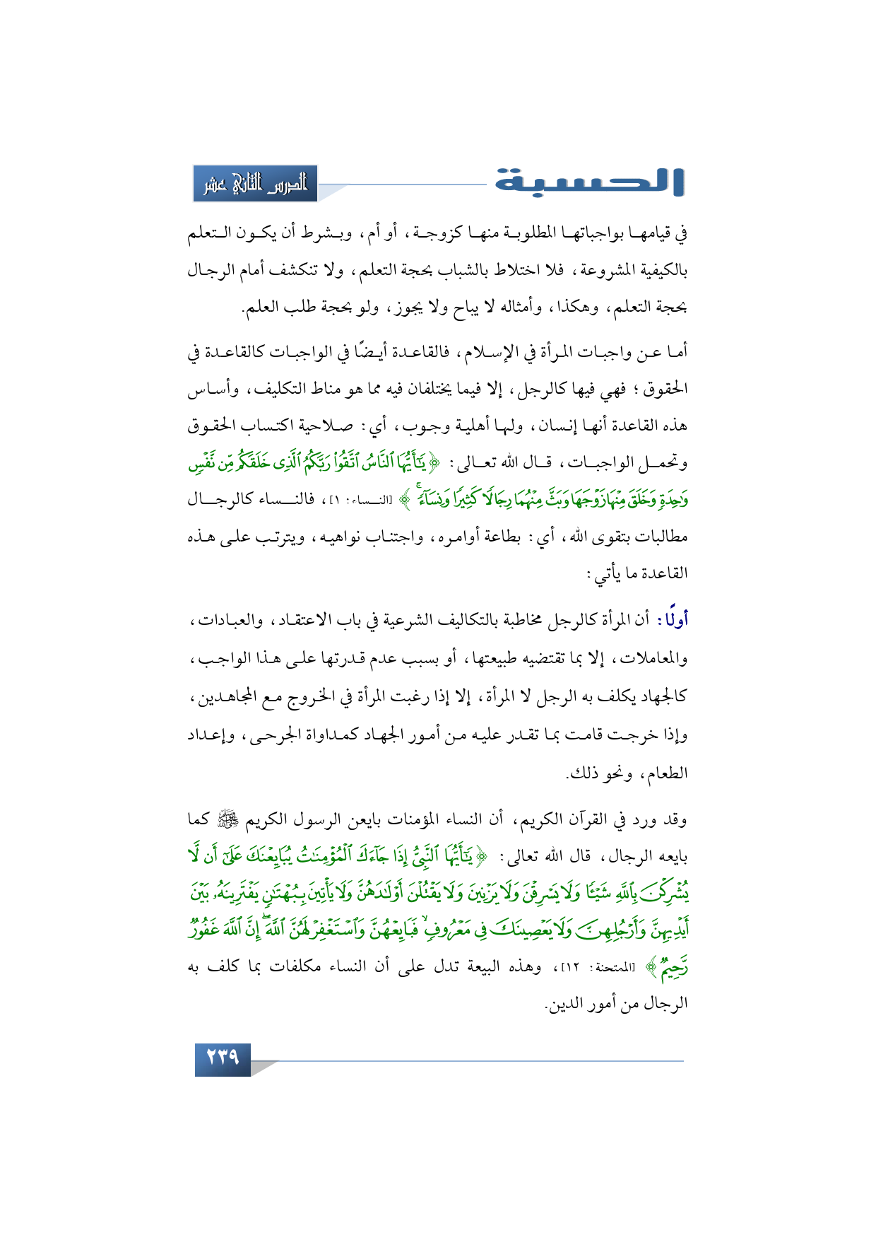 وقد ورد في القرآن الكريم أن النساء المؤمنات بايعن الرسول الكريم -صلى الله عليه وسلم- كما بايعه الرجال قال الله تعالى: {يَا أَيُّهَا النَّبِيُّ إِذَا جَاءَكَ الْمُؤْمِنَاتُ يُبَايِعْنَكَ عَلَى أَنْ لَا يُشْرِكْنَ بِاللَّهِ شَيْئًا وَلَا يَسْرِقْنَ وَلَا يَزْنِينَ وَلَا يَقْتُلْنَ أَوْلَادَهُنَّ وَلَا يَأْتِينَ بِبُهْتَانٍ يَفْتَرِينَهُ بَيْنَ أَيْدِيهِنَّ وَأَرْجُلِهِنَّ وَلَا يَعْصِينَكَ فِي مَعْرُوفٍ فَبَايِعْهُنَّ وَاسْتَغْفِرْ لَهُنَّ اللَّهَ إِنَّ اللَّهَ غَفُورٌ رَحِيمٌ} (الممتحنة: 12)، وهذه البيعة تدل على أن النساء مكلفات بما كلف به الرجال من أمور الدين.