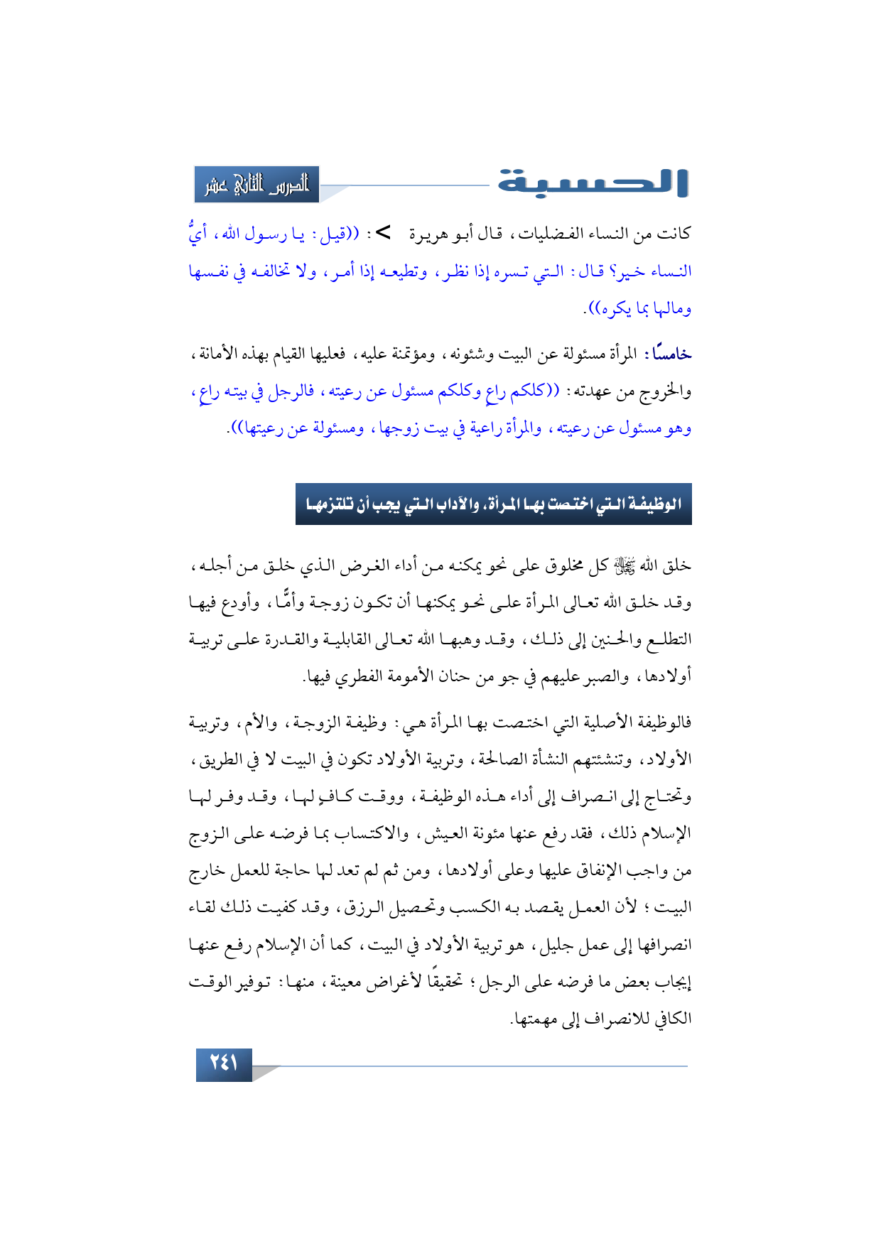 الوظيفة التي اختصت بها المرأة، والآداب التي يجب أن تلتزمها
