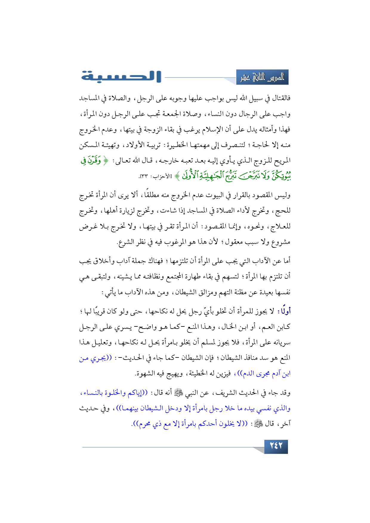 فالقتال في سبيل الله ليس بواجب عليها وجوبه على الرجل، والصلاة في المساجد واجب على الرجال دون النساء، وصلاة الجمعة تجب على الرجل دون المرأة، فهذا وأمثاله يدل على أن الإسلام يرغب في بقاء الزوجة في بيتها وعدم الخروج منه إلا لحاجة أو سبب معقول لتنصرف إلى مهمتها الخطيرة: تربية الأولاد، وتهيئة المسكن المريح للزوج الذي يأوي إليه بعد تعبه خارجه، قال الله تعالى: {وَقَرْنَ فِي بُيُوتِكُنَّ وَلَا تَبَرَّجْنَ تَبَرُّجَ الْجَاهِلِيَّةِ الْأُولَى} (الأحزاب: 33).