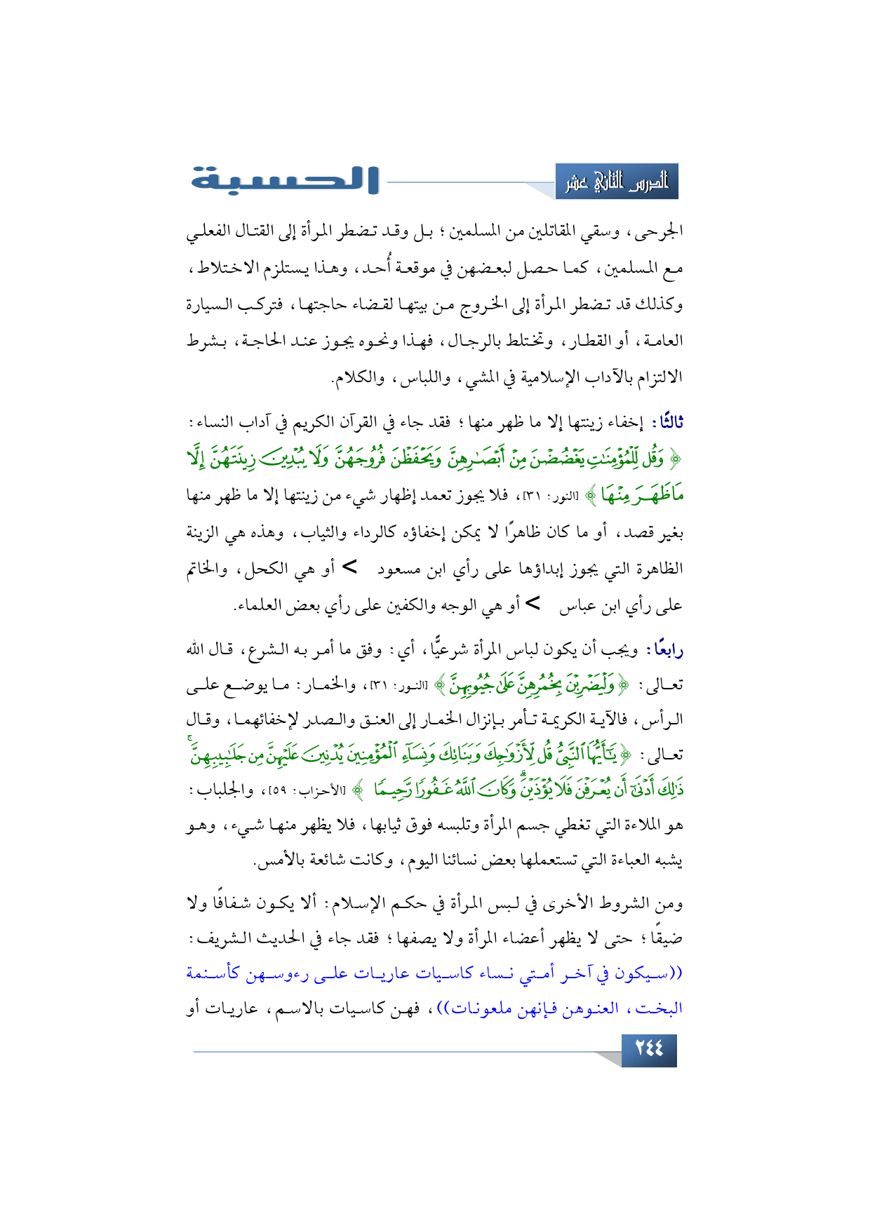 رابعًا: ويجب أن يكون لباس المرأة شرعيًّا، أي: وفق ما أمر به الشرع، قال الله تعالى: {وَلْيَضْرِبْنَ بِخُمُرِهِنَّ عَلَى جُيُوبِهِنَّ} (النور: 31)، والخمار ما يوضع على الرأس، فالآية الكريمة تأمر بإنزال الخمار إلى العنق والصدر لإخفائهما، وقال تعالى: {يَا أَيُّهَا النَّبِيُّ قُلْ لِأَزْوَاجِكَ وَبَنَاتِكَ وَنِسَاءِ الْمُؤْمِنِينَ يُدْنِينَ عَلَيْهِنَّ مِنْ جَلَابِيبِهِنَّ ذَلِكَ أَدْنَى أَنْ يُعْرَفْنَ فَلَا يُؤْذَيْنَ وَكَانَ اللَّهُ غَفُورًا رَحِيمًا} (الأحزاب: 59)، والجلباب هو الملاءة التي تغطي جسم المرأة وتلبسه فوق ثيابها، فلا يظهر منها شيء، وهو يشبه العباءة التي تستعملها بعض نسائنا اليوم، وكانت شائعة بالأمس.