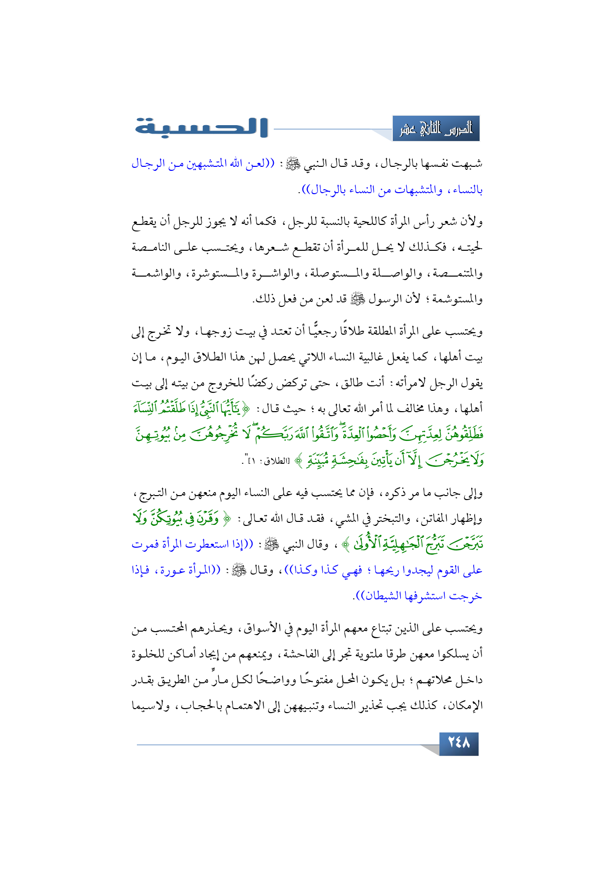 وإلى جانب ما مر ذكره فإن مما يحتسب فيه على النساء اليوم منعهن من التبرج، وإظهار المفاتن، والتبختر في المشي، فقد قال الله تعالى: {وَقَرْنَ فِي بُيُوتِكُنَّ وَلَا تَبَرَّجْنَ تَبَرُّجَ الْجَاهِلِيَّةِ الْأُولَى}، وقال النبي -صلى الله عليه وسلم-: ((إذا استعطرت المرأة فمرت على القوم ليجدوا ريحها؛ فهي كذا وكذا))، وقال -صلى الله عليه وسلم-: ((المرأة عورة، فإذا خرجت استشرفها الشيطان)).