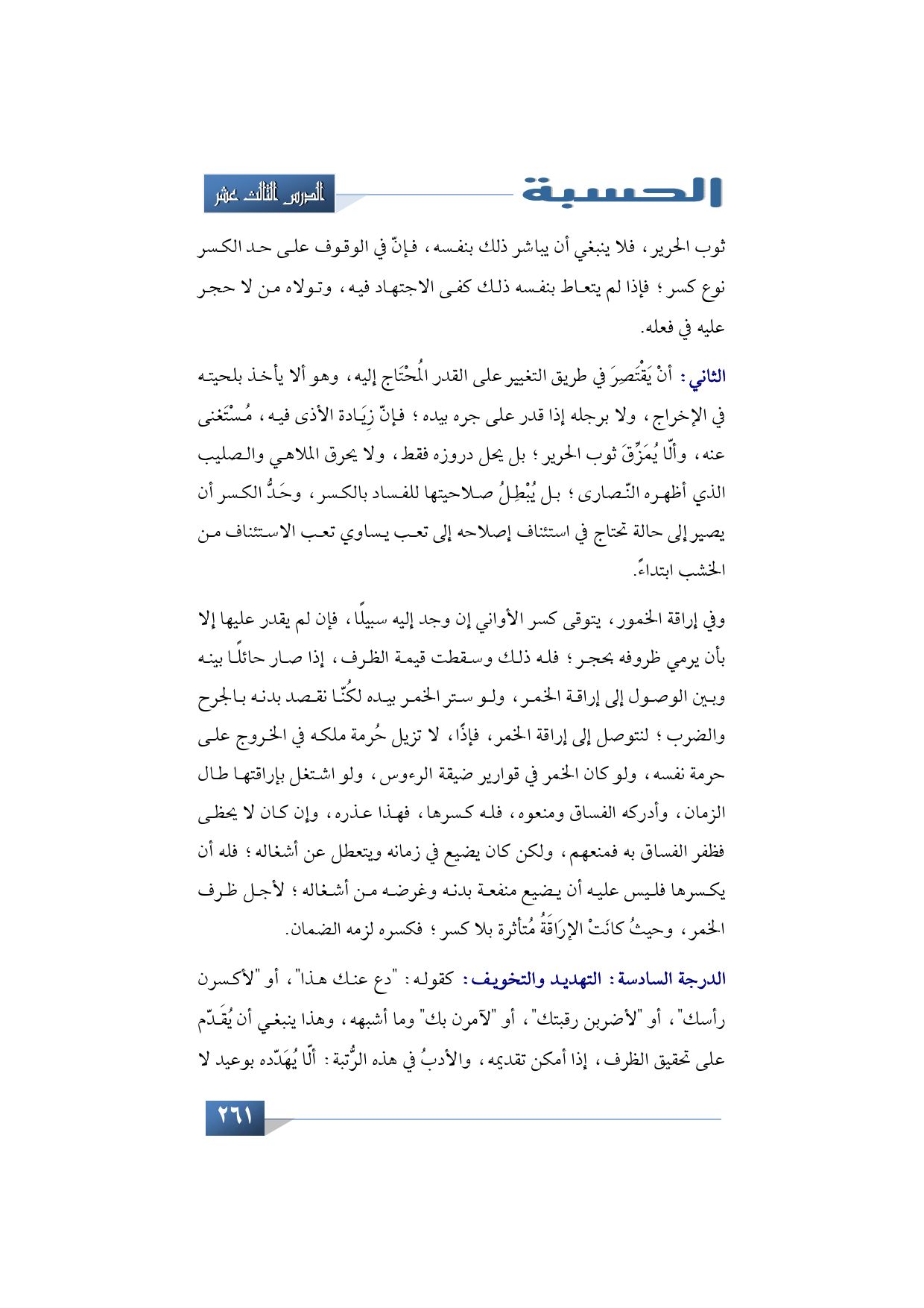 الثاني: أنْ يَقْتَصِرَ في طريق التغيير على القدر المُحْتَاج إليه، وهو ألا يأخذ بلحيته في الإخراج، ولا برجله إذا قدر على جره بيده؛ فإنّ زِيَادة الأذى فيه، مُسْتَغنى عنه، وألّا يُمَزِّقَ ثوب الحرير بل يحل دروزه فقط، ولا يحرق الملاهي والصليب الذي أظهره النّصارى، بل يُبْطِلُ صلاحيتها للفساد بالكسر، وحَدُّ الكسر أن يصير إلى حالة تحتاج في استئناف إصلاحه إلى تعب يساوي تعب الاستئناف من الخشب ابتداءً.