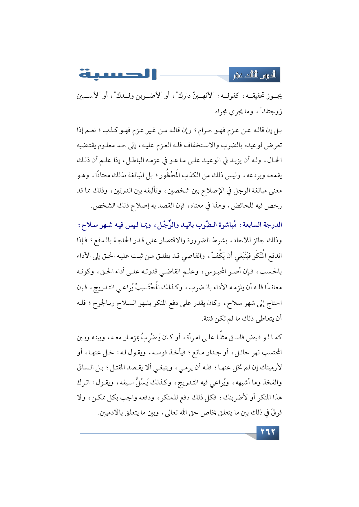 الدرجة السابعة: مُباشرة الضّرب باليد والرِّجْل، وغير ذلك مما ليس فيه شهر سلاح: وذلك جائز للآحاد بشرط الضرورة والاقتصار على قدر الحاجة بالدفع؛ فإذا اندفع المُنْكَر فيَنْبَغي أن يَكُفّ، والقاضي قد يطلق من ثبت عليه الحق إلى الأداء بالحسب، فإن أصر المحبوس وعلم القاضي قدرته على أداء الحق، وكونه معاندًا فله أن يلزمه الأداء بالضرب على التدريب كما يحتاج إليه، وكذلك المُحْتَسِبْ يُراعي التدريج، فإن احتاج إلى شهر سلاح، وكان يقدر على دفع المنكر بشهر السلاح وبالجرح؛ فله أن يتعاطى ذلك ما لم تكن فتنة.