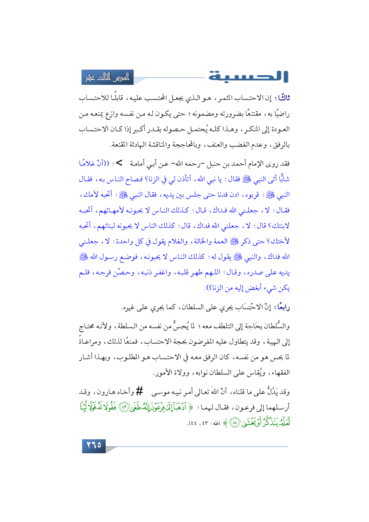رابعًا: إنّ الاحْتِسَاب يجري على السلطان كما يجري على غيره، كما بينا ذلك. والسُّلطان بِحَاجة إلى التلطف معه، لما يُحِسُّ من نفسه من السلطة، ولأنه محتاج إلى الهيبة، وقد يتطاول عليه المغرضون بحجة الاحتساب، فمنعًا لذلك ومراعاة لما يحس هو من نفسه، كان الرفق معه في الاحتساب هو المطلوب. وبهذا أشار الفقهاء، وقد أفردنا الاحتساب على السُّلطان بدَرْسٍ مُسْتَقِلٍّ، ويُقاس على السلطان نوابه، وولاة الأمور.