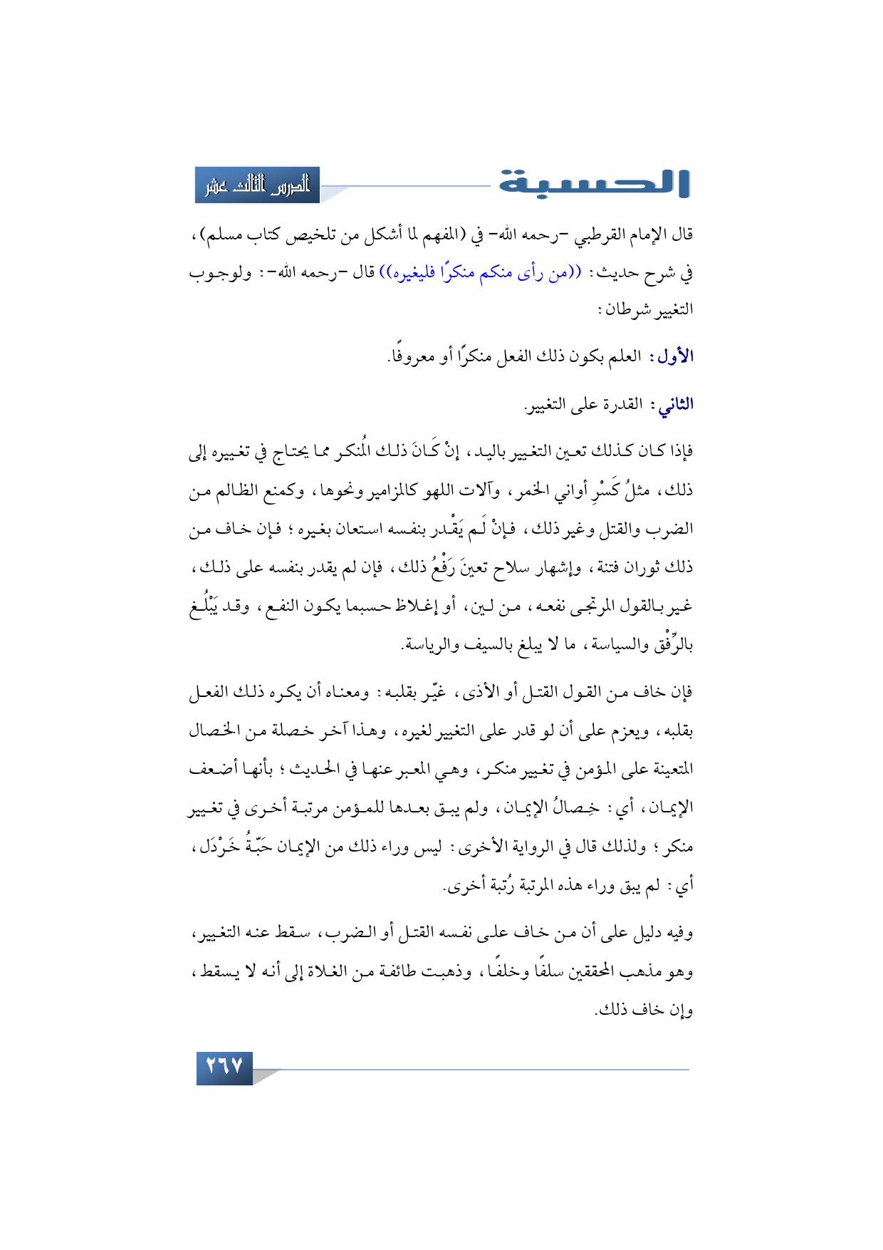 قال الإمام القرطبي -رحمه الله- في (المفهم لما أشكل من تلخيص كتاب مسلم) في شرح حديث: ((من رأى منكم منكرًا فليغيره)) قال -رحمه الله-: ولوجوب التغيير شرطان:
