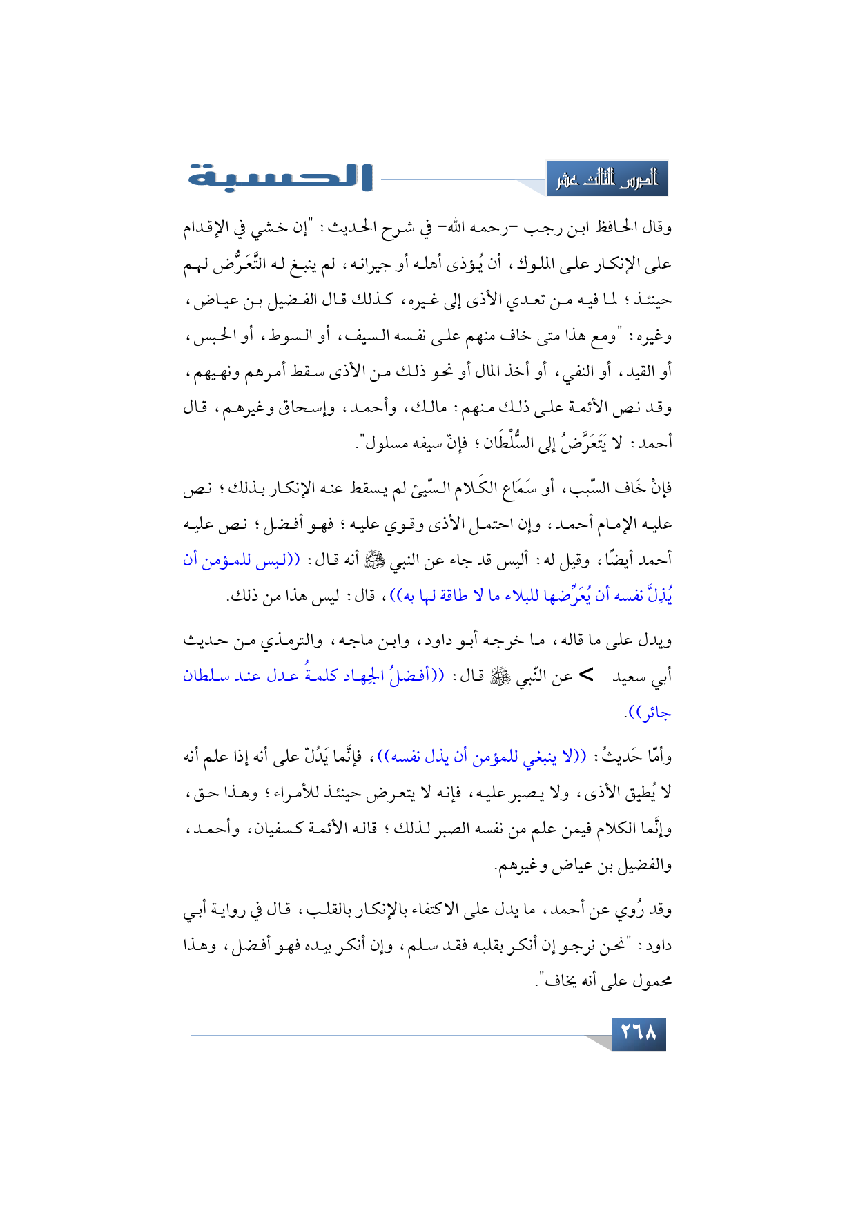 وأمّا حَديثُ ((لا ينبغي للمؤمن أن يذل نفسه))، فإنَّما يَدُلّ على أنه إذا علم أنه لا يُطيق الأذى ولا يصبر عليه، فإنه لا يتعرض حينئذ للأمراء وهذا حق، وإنَّما الكلام فيمن علم من نفسه الصبر لذلك، قاله الأئمة كسفيان وأحمد والفضيل بن عياض وغيرهم.