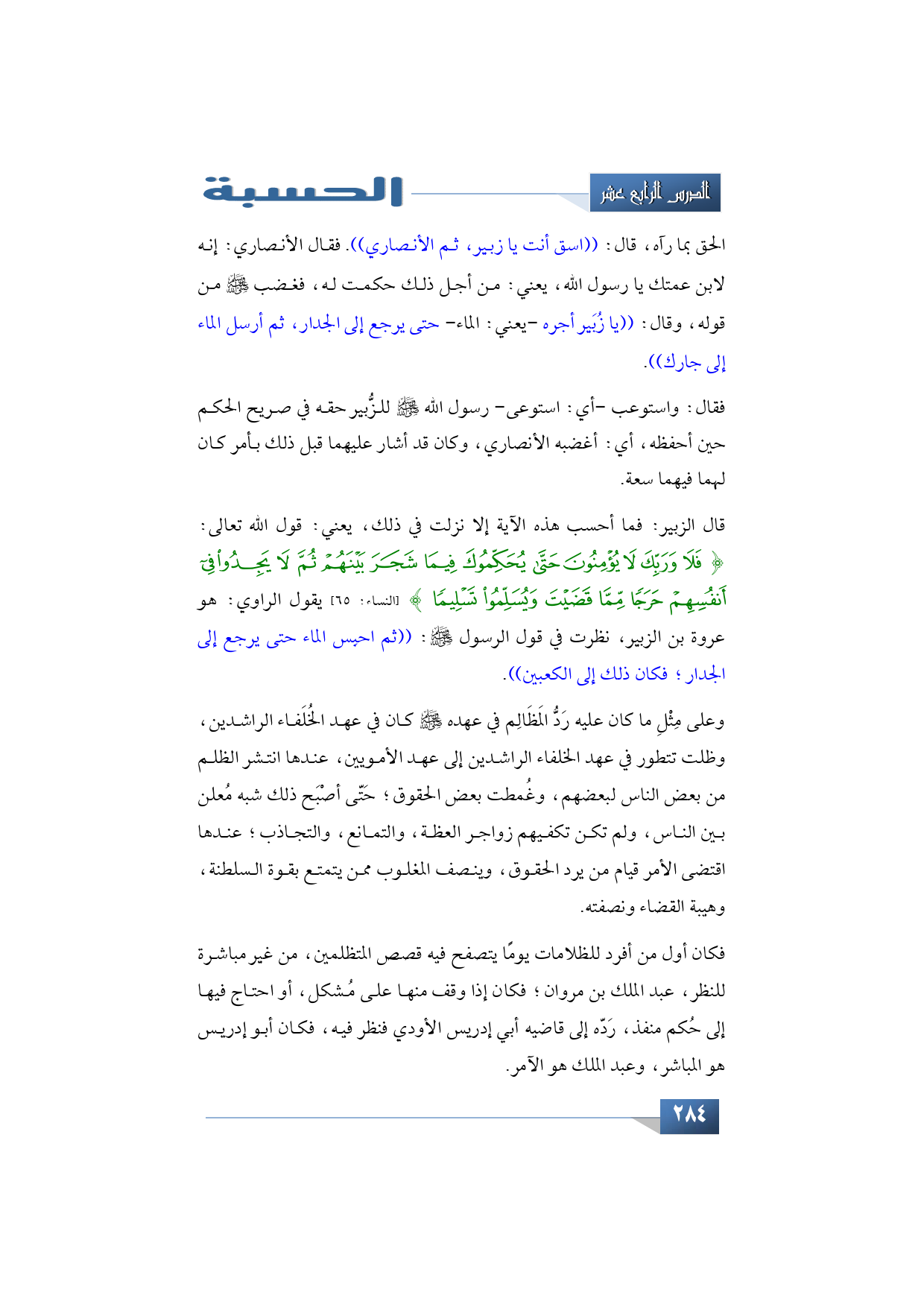 قال الزبير: فما أحسب هذه الآية إلا نزلت في ذلك يعني قول الله تعالى: {فَلَا وَرَبِّكَ لَا يُؤْمِنُونَ حَتَّى يُحَكِّمُوكَ فِيمَا شَجَرَ بَيْنَهُمْ ثُمَّ لَا يَجِدُوا فِي أَنْفُسِهِمْ حَرَجًا مِمَّا قَضَيْتَ وَيُسَلِّمُوا تَسْلِيمًا} (النساء: 65) يقول الراوي: هو عروة بن الزبير، نظرت في قول الرسول -صلى الله عليه وسلم-: ((ثم احبِس الماء حتى يرجع إلى الجدار؛ فكان ذلك إلى الكعبين)).