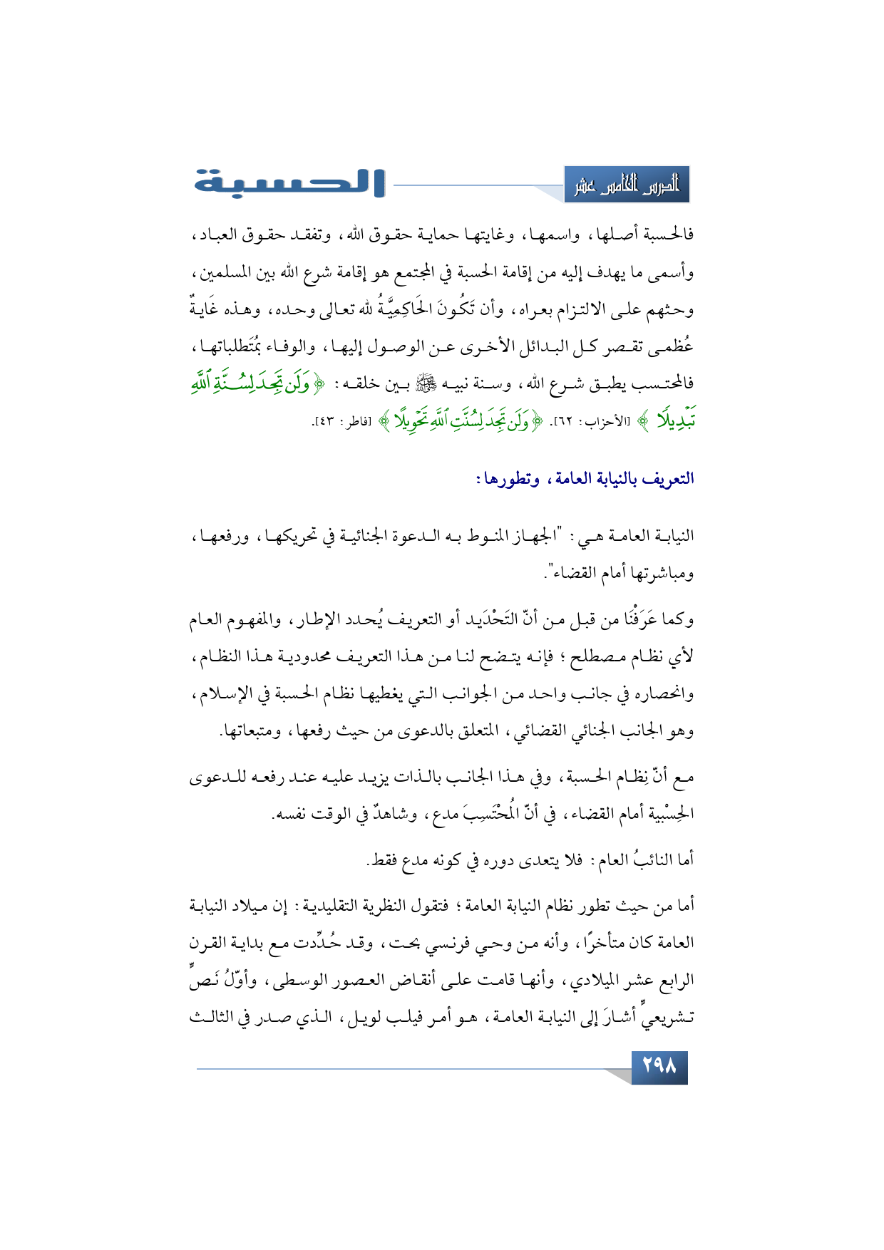وكما عَرَفْنَا من قبل من أنّ التَحْدَيد أو التعريف يُحدد الإطار والمفهوم العام لأي نظام مصطلح؛ فإنه يتضح لنا من هذا التعريف محدودية هذا النظام وانحصاره في جانب واحد من الجوانب التي يغطيها نظام الحسبة في الإسلام، وهو الجانب الجنائي القضائي، المتعلق بالدعوى من حيث رفعها ومتبعاتها.