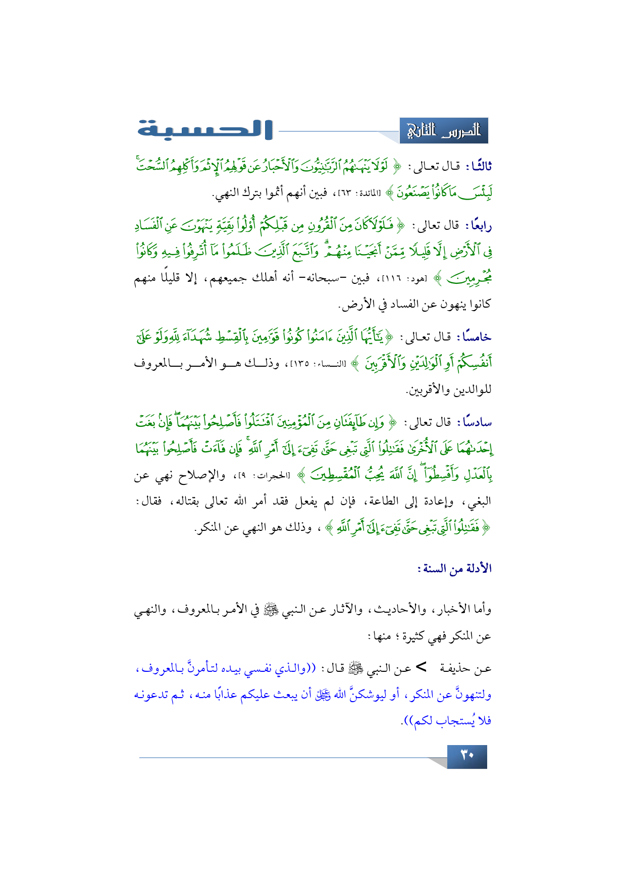 وقال تعالى: {وَإِنْ طَائِفَتَانِ مِنَ الْمُؤْمِنِينَ اقْتَتَلُوا فَأَصْلِحُوا بَيْنَهُمَا فَإِنْ بَغَتْ إِحْدَاهُمَا عَلَى الْأُخْرَى فَقَاتِلُوا الَّتِي تَبْغِي حَتَّى تَفِيءَ إِلَى أَمْرِ اللَّهِ فَإِنْ فَاءَتْ فَأَصْلِحُوا بَيْنَهُمَا بِالْعَدْلِ وَأَقْسِطُوا إِنَّ اللَّهَ يُحِبُّ الْمُقْسِطِينَ} (الحجرات: 9)، والإصلاح نهي عن البغي، وإعادة إلى الطاعة، فإن لم يفعل فقد أمر الله تعالى بقتاله فقال: {فَقَاتِلُوا الَّتِي تَبْغِي حَتَّى تَفِيءَ إِلَى أَمْرِ اللَّهِ} وذلك هو النهي عن المنكر.