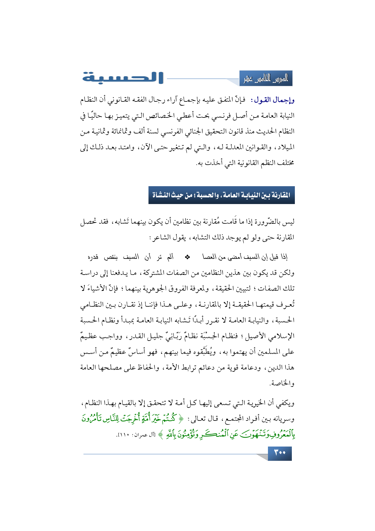 ولكن قد يكون بين هذين النظامين من الصفات المشتركة، ما يدفع الدارس إلى دراسة تلك الصفات؛ لتبيين الحقيقة، ولمعرفة الفروق الجوهرية بينهما؛ فإنّ الأشياءَ لا تُعرف قيمتها الحقيقة إلا بالمقارنة، وعلى هذا فإننا إذ نقارن بين النظامي الحسبة والنيابة العامة لا نقرر أبدًا تَشابه النيابة العامة بمبدأ ونظام الحسبة الإسلامي الأصيل؛ فنظام الحِسْبَة نظامٌ رَبّانِيٌ جليل القدر، وواجب عظيمٌ على المسلمين أن يهتموا به، ويُطَبَِّقوه فيما بينهم، فهو أساسٌ عظيمٌ من أسس هذا الدين، ودعامة قوية من دعائم ترابط الأمة والحفاظ على مصلحها العامة والخاصة.