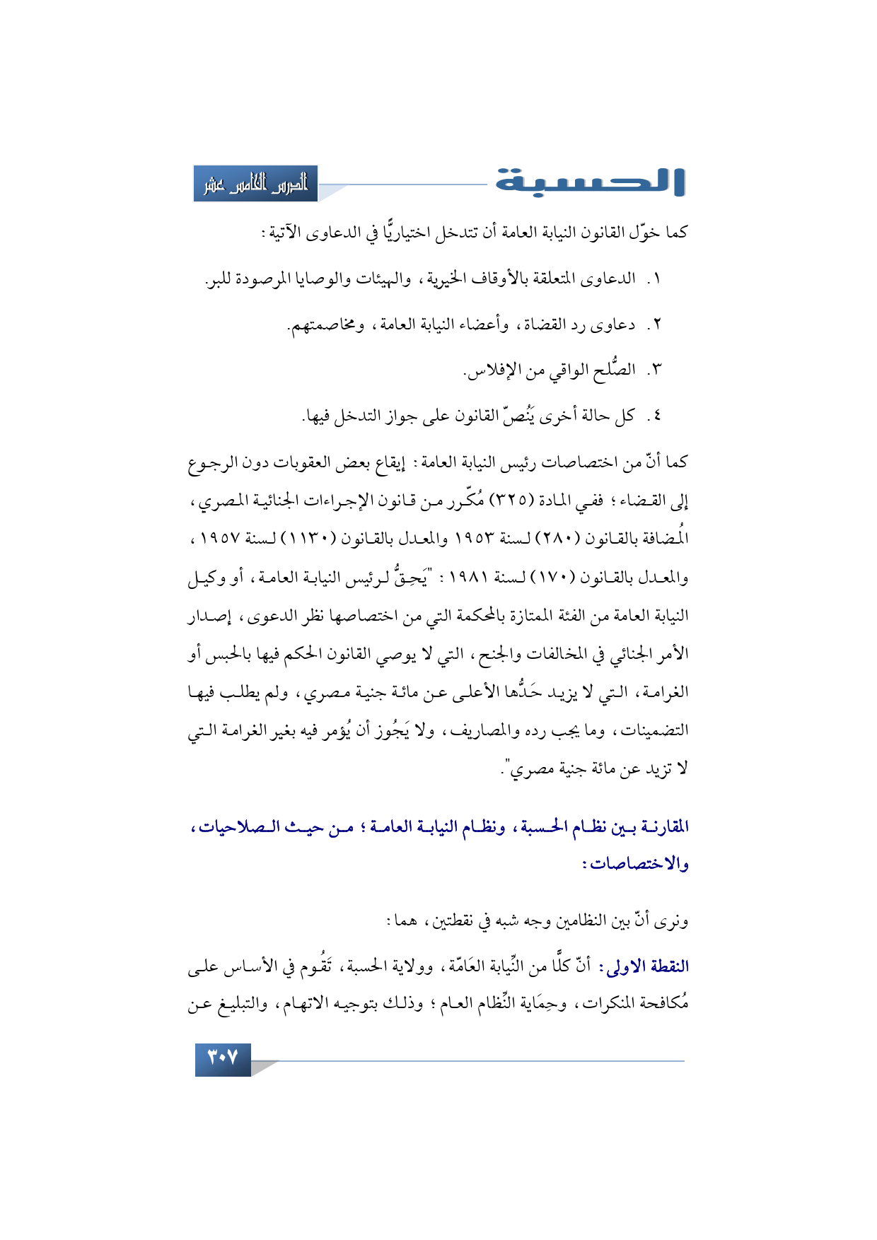 أنّ كلًّا من النِّيابة العَامّة وولاية الحسبة، تَقُوم في الأساس على مُكافحة المنكرات، وحِمَاية النِّظام العام، وذلك بتوجيه الاتهام والتبليغ عن