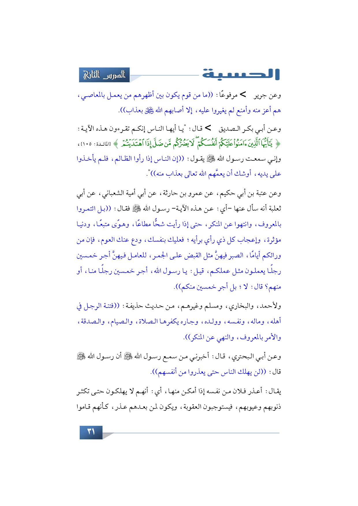 وعن أبي بكر الصديق -رضي الله عنه- قال: "يا أيها الناس إنكم تقرءون هذه الآية: {يَا أَيُّهَا الَّذِينَ آمَنُوا عَلَيْكُمْ أَنْفُسَكُمْ لَا يَضُرُّكُمْ مَنْ ضَلَّ إِذَا اهْتَدَيْتُمْ} (المائدة: 105)، وإني سمعت رسول الله -صلى الله عليه وسلم- يقول: ((إن الناس إذا رأوا الظالم، فلم يأخذوا على يديه أوشك أن يعمَّهم الله تعالى بعذاب منه)) ".