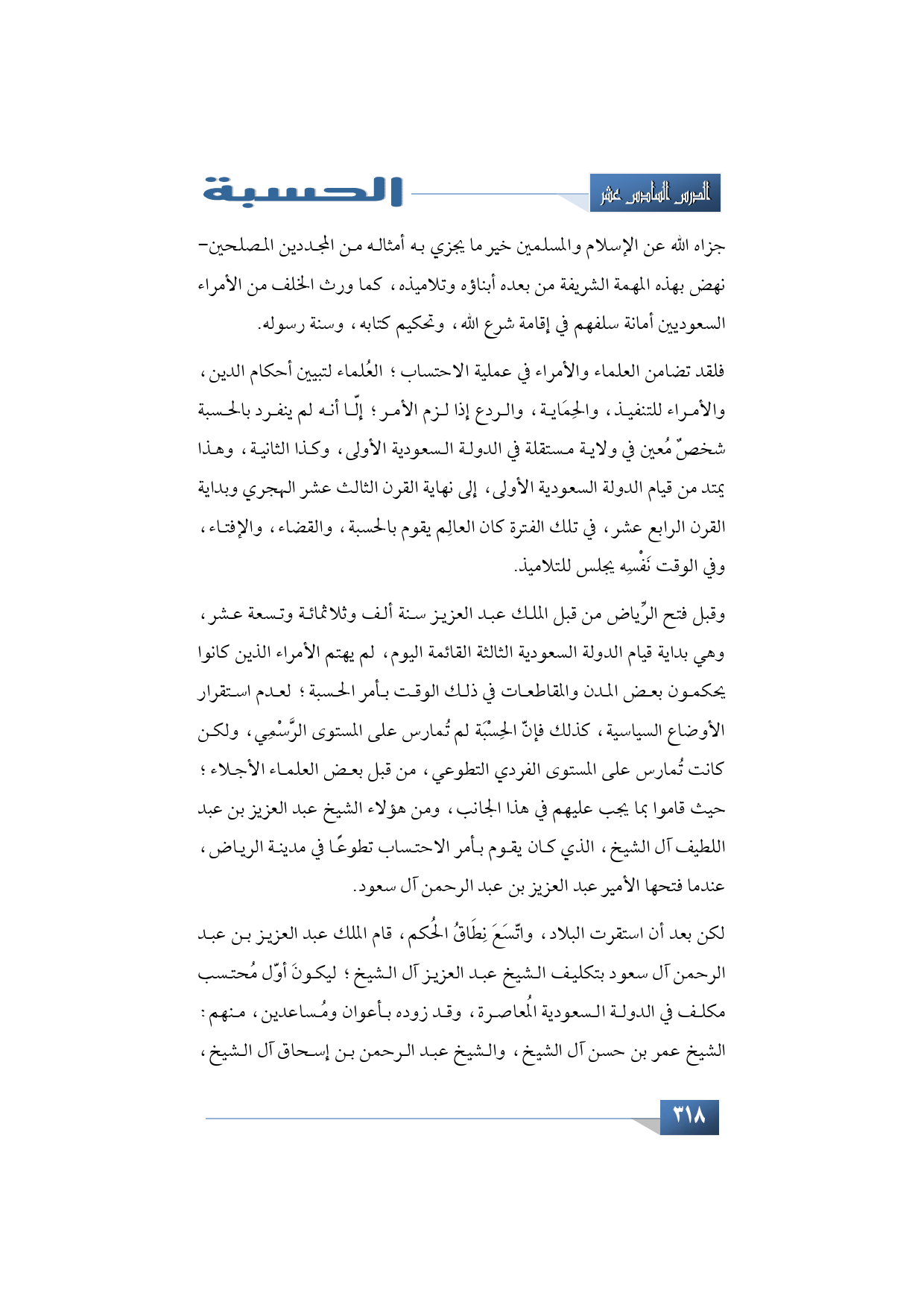 فلقد تضامن العلماء والأمراء في عملية الاحتساب، العُلماء لتبيين أحكام الدين، والأمراء للتنفيذ والحِمَاية والردع إذا لزم الأمر؛ إلّا أنه لم ينفرد بالحسبة شخصٌ مُعين في ولاية مستقلة في الدولة السعودية الأولى، وكذا الثانية، وهذا يمتد من قيام الدولة السعودية الأولى إلى نهاية القرن الثالث عشر الهجري وبداية القرن الرابع عشر، في تلك الفترة كان يقوم العالم بالحسبة والقضاء والإفتاء، وفي الوقت نَفْسِه يجلس للتلاميذ.