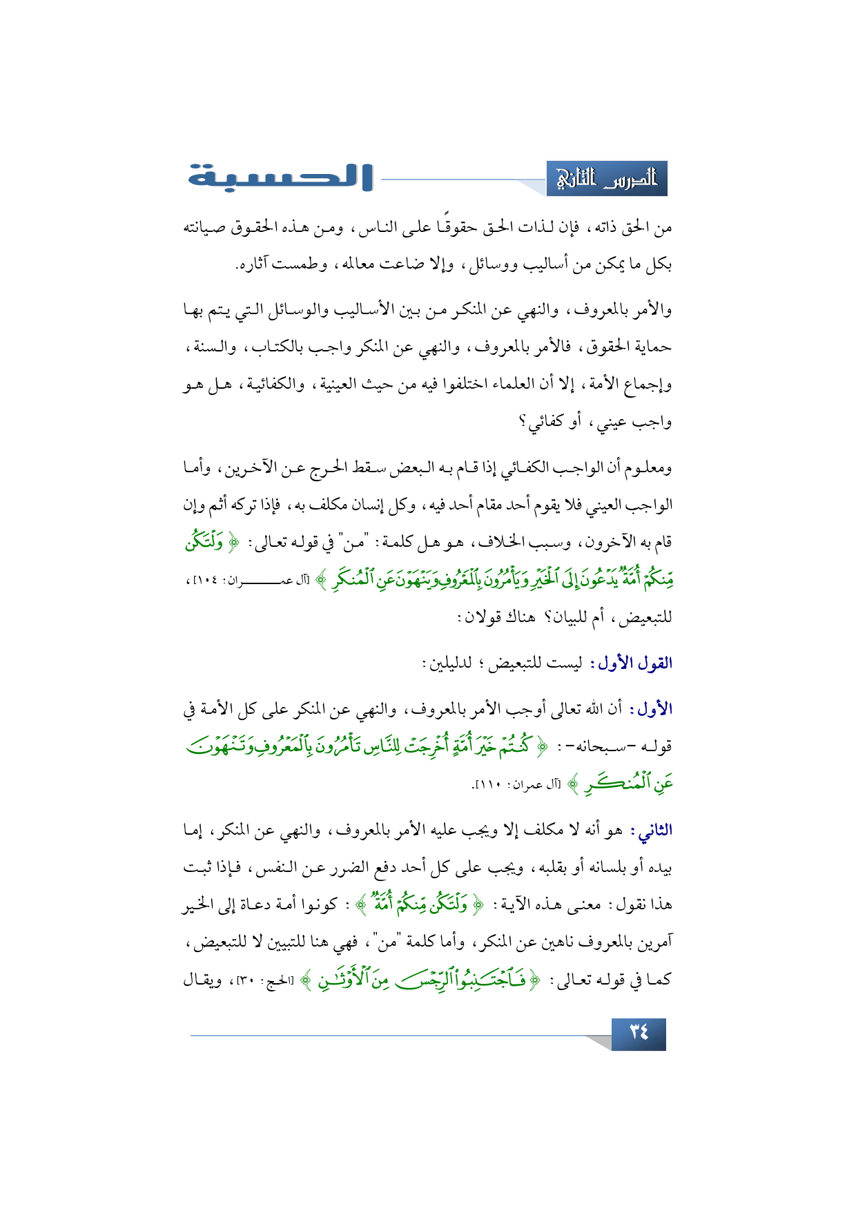 الأول: أن الله تعالى أوجب الأمر بالمعروف والنهي عن المنكر على كل الأمة في قوله سبحانه: {كُنْتُمْ خَيْرَ أُمَّةٍ أُخْرِجَتْ لِلنَّاسِ تَأْمُرُونَ بِالْمَعْرُوفِ وَتَنْهَوْنَ عَنِ الْمُنْكَرِ} (آل عمران: 110).