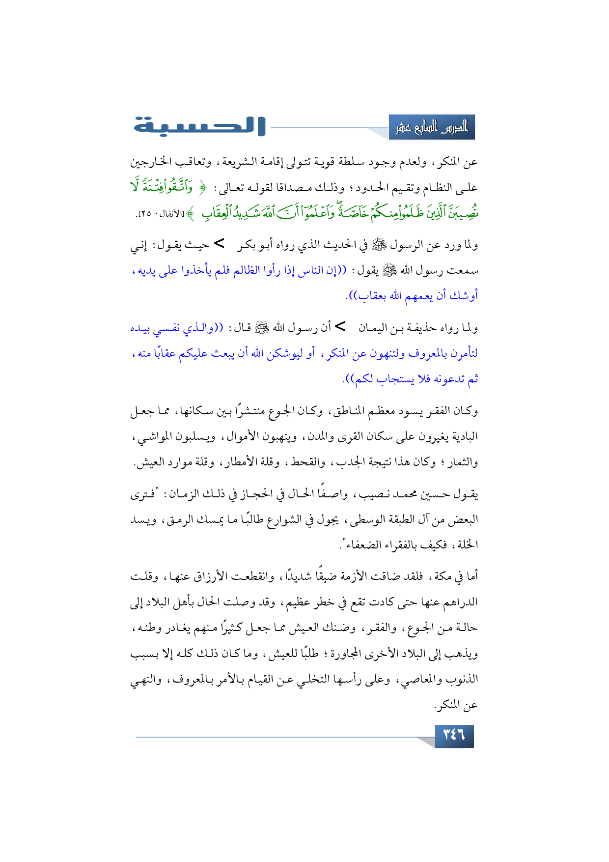 عن المنكر، ولعدم وجود سلطة قوية تتولى إقامة الشريعة، وتعاقب الخارجين على النظام وتقيم الحدود وذلك مصداقا لقول الله تعالى: {وَات َّقُواْ فِتْنَةً لاَّ تُصِيبَنَّ الَّذِينَ ظَلَمُواْ مِنكُمْ خَآصَّةً وَاعْلَمُواْ أَنَّ اللهَ شَدِيدُ الْعِقَاب} (الأنفال: 25).
