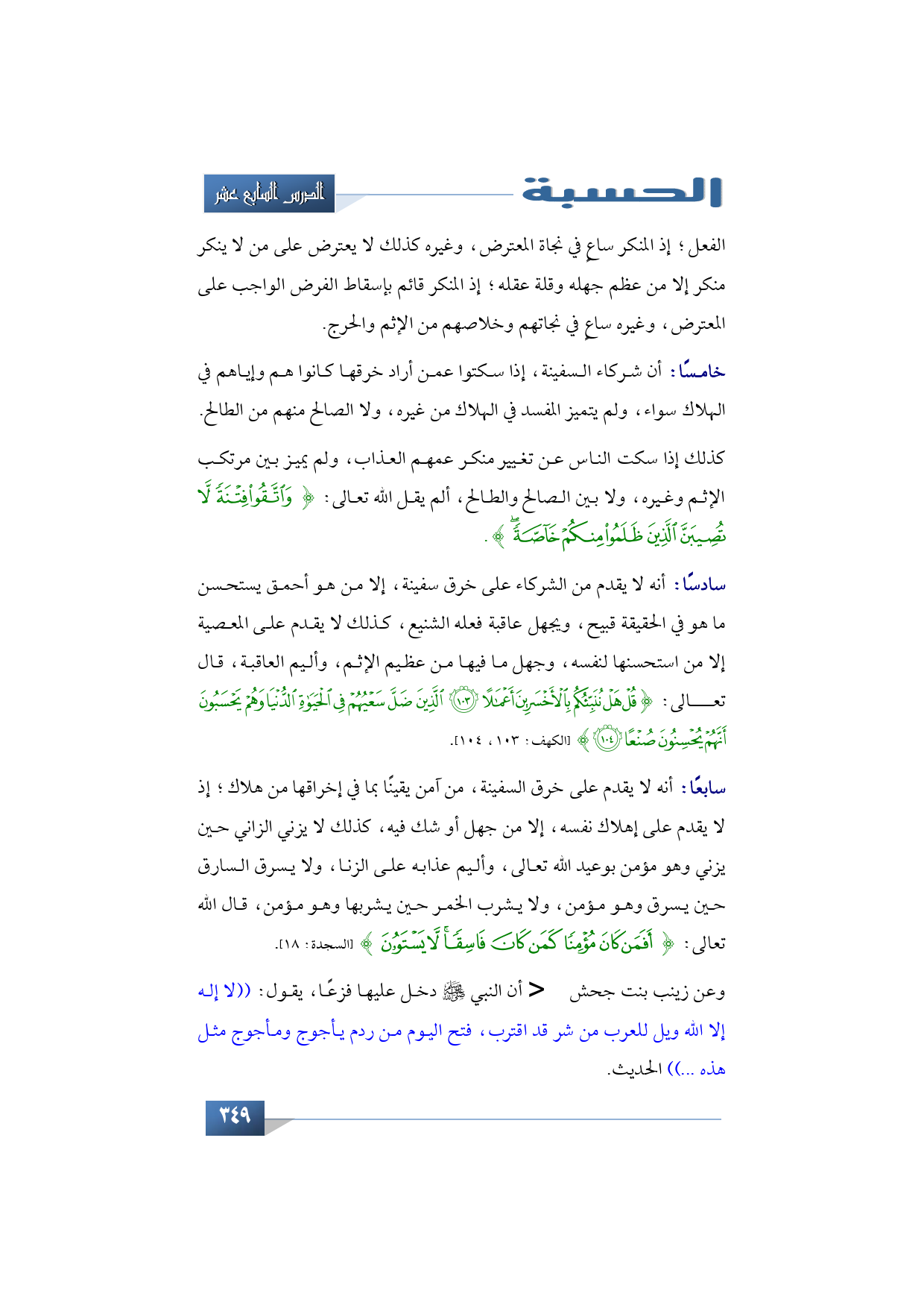 خامسًا: أن شركاء السفينة إذا سكتوا عمن أراد خرقها كانوا هم وإياهم في الهلاك سواء، ولم يتميز المفسد في الهلاك من غيره، ولا الصالح منهم من الطالح.