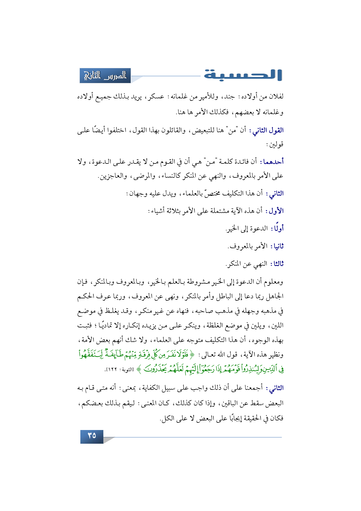 الأول: أن هذه الآية مشتملة على الأمر بثلاثة أشياء الدعوة إلى الخير، والأمر بالمعروف والنهي عن المنكر. ومعلوم أن الدعوة إلى الخير مشروطة بالعلم بالخير وبالمعروف وبالمنكر، فإن الجاهل ربما دعا إلى الباطل وأمر بالمنكر، ونهى عن المعروف، وربما عرف الحكم في مذهبه وجهله في مذهب صاحبه، فنهاه عن غير منكر، وقد يغلظ في موضع اللين، ويلين في موضع الغلظة، وينكر على من يزيده إنكاره إلا تماديًا؛ فثبت بهذه الوجوه أن هذا التكليف متوجه على العلماء، ولا شك أنهم بعض الأمة، ونظير هذه الآية قول الله تعالى: {فَلَوْلَا نَفَرَ مِنْ كُلِّ فِرْقَةٍ مِنْهُمْ طَائِفَةٌ لِيَتَفَقَّهُوا فِي الدِّينِ وَلِيُنْذِرُوا قَوْمَهُمْ إِذَا رَجَعُوا إِلَيْهِمْ لَعَلَّهُمْ يَحْذَرُونَ} (التوبة: 122).