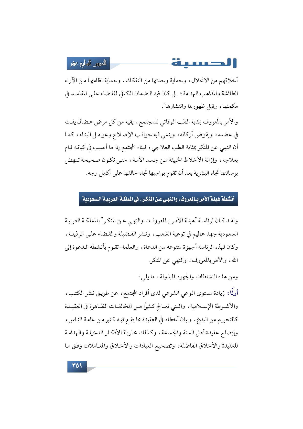 ولقد كان لرئاسة "هيئة الأمر بالمعروف والنهي عن المنكر" بالمملكة العربية السعودية جهد عظيم في توعية الشعب، ونشر الفضيلة والقضاء على الرذيلة، وكان لهذه الرئاسة أجهزة متنوعة من الدعاة والعلماء تقوم بأنشطة الدعوة إلى الله والأمر بالمعروف والنهي عن المنكر.