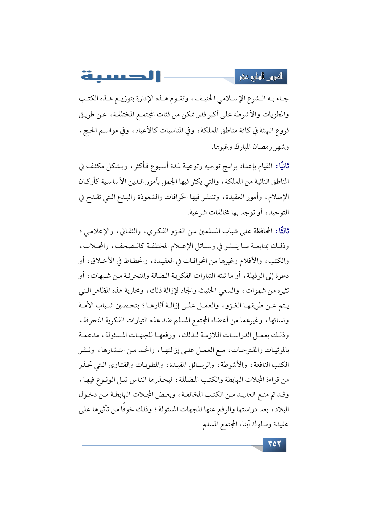 ثانيًا: القيام بإعداد برامج توجيه وتوعية لمدة أسبوع فأكثر، وبشكل مكثف في المناطق النائية من المملكة، والتي يكثر فيها الجهل بأمور الدين الأساسية مثل أركان الإسلام، وأمور العقيدة وتنتشر فيها الخرافات والشعوذة والبدع التي تقدح في التوحيد أو توجد بها مخالفات شرعية.
