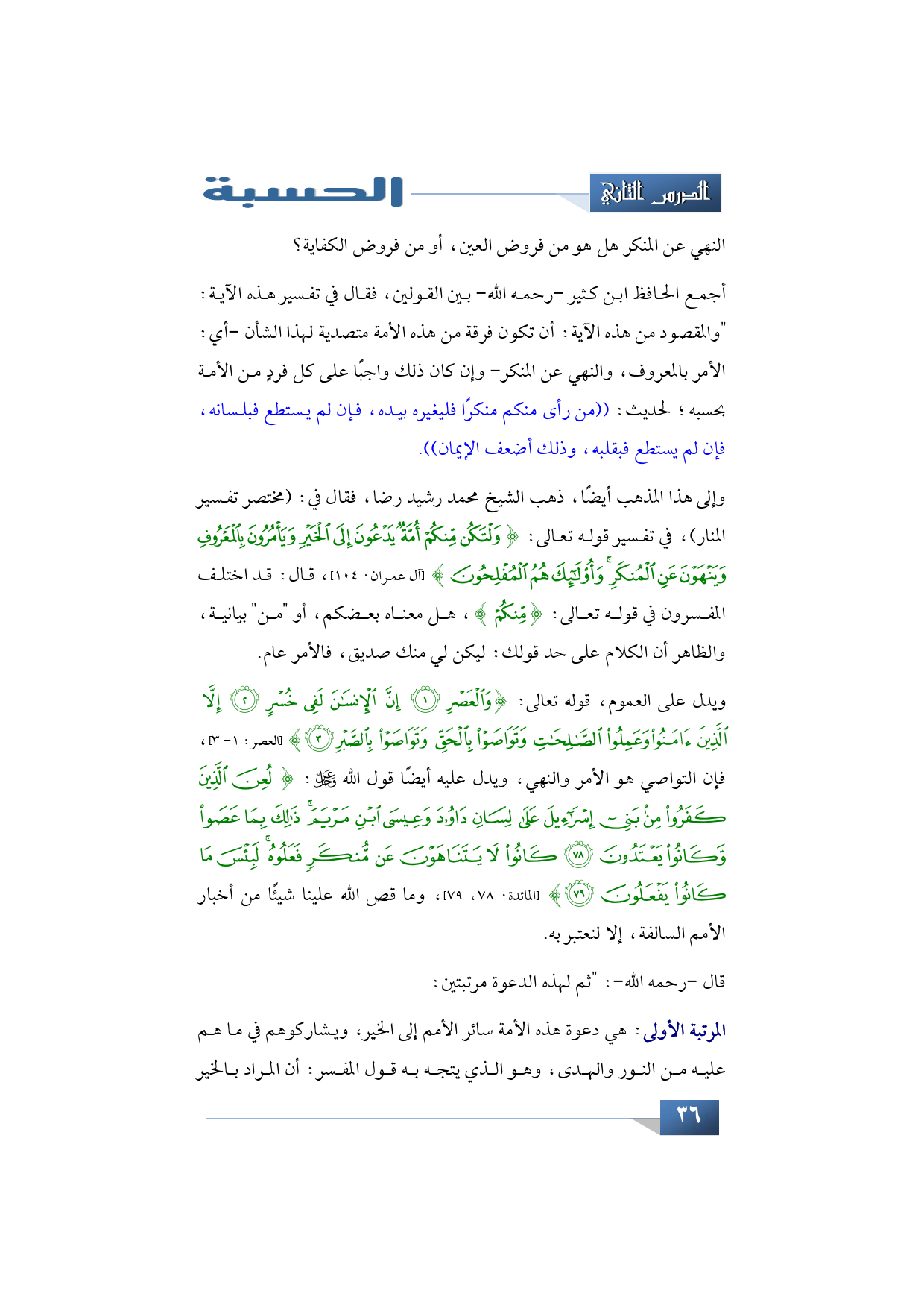 وإلى هذا المذهب أيضًا ذهب الشيخ محمد رشيد رضا فقال في (مختصر تفسير المنار) في تفسير قوله تعالى {وَلْتَكُنْ مِنْكُمْ أُمَّةٌ يَدْعُونَ إِلَى الْخَيْرِ وَيَأْمُرُونَ بِالْمَعْرُوفِ وَيَنْهَوْنَ عَنِ الْمُنْكَرِ وَأُولَئِكَ هُمُ الْمُفْلِحُونَ} (آل عمران: 104)، قال الشيخ -رحمه الله-: قد اختلف المفسرون في قوله تعالى {مِنْكُمْ} هل معناه بعضكم أم "من" بيانية، والظاهر أن الكلام على حد قولك ليكن لي منك صديق، فالأمر عام.