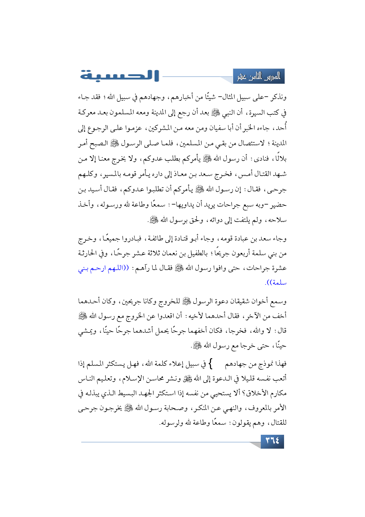 فهذا نموذج من جهادهم -رضي الله عنهم- في سبيل إعلاء كلمة الله، فهل يستكثر المسلم إذا أتعب نفسه قليلا في الدعوة إلى الله -عز وجل- ونشر محاسن الإسلام، وتعليم الناس مكارم الأخلاق؟ ألا يستحيي من نفسه إذا استكثر الجهد البسيط الذي يبذله في الأمر بالمعروف والنهي عن المنكر، وصحابة رسول الله -صلى الله عليه وسلم- يخرجون جرحى للقتال وهم يقولون: سمعًا وطاعة لله ولرسوله.