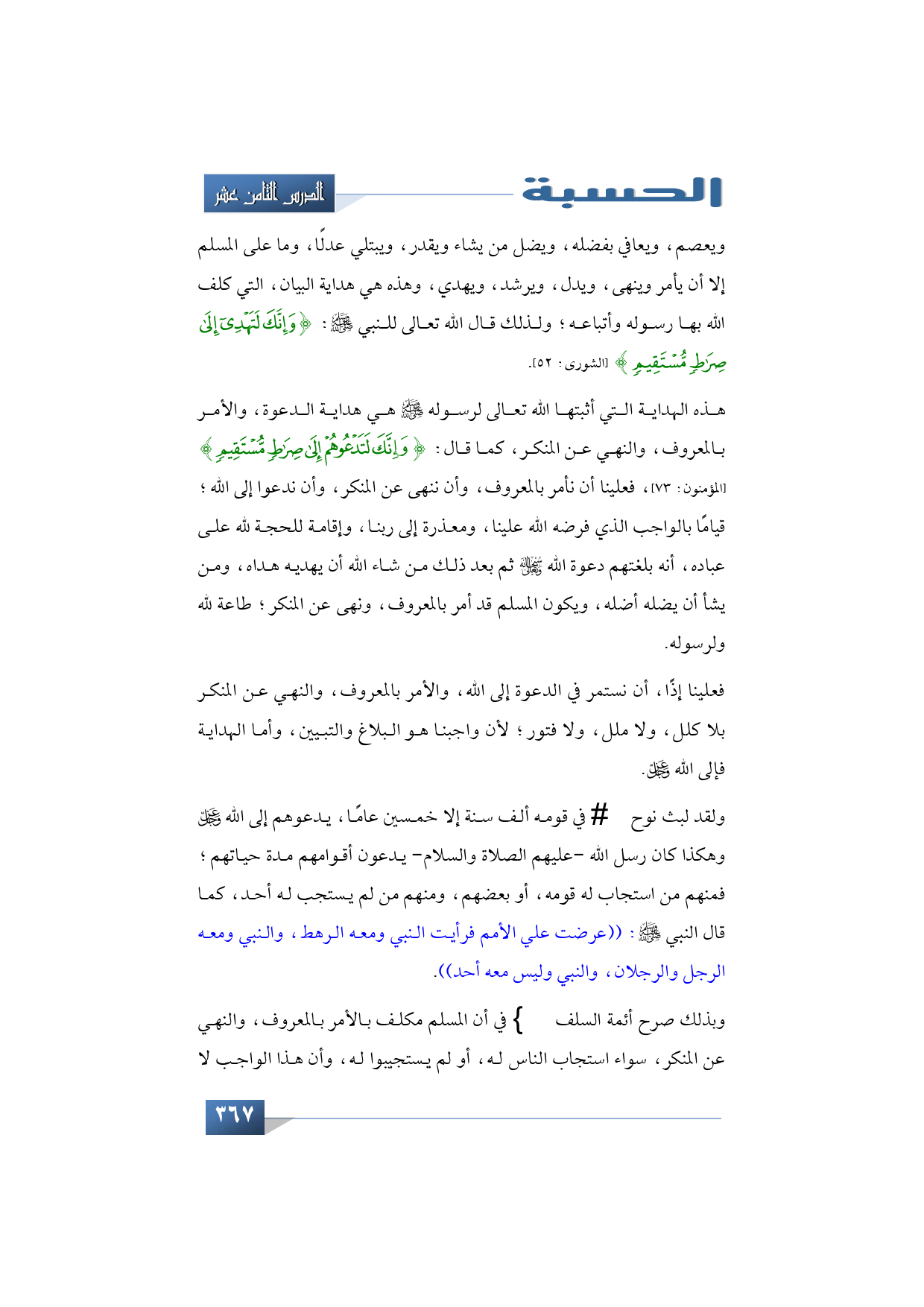 هذه الهداية التي أثبتها الله تعالى رسوله -صلى الله عليه وسلم- هي هداية الدعوة، والأمر بالمعروف والنهي عن ال منكر، كما قال: {وَإِنَّكَ لَتَدْعُوهُمْ إِلَى صِرَاطٍ مُسْتَقِيمٍ} (المؤمنون: 73)، ف علينا أن نأمر بالمعرو ف وأن ننهى عن المنكر، وأن ندعوا إلى الله قيامًا بالواجب الذي فرضه الله علينا، ومعذرة إلى ربنا، وإقامة للحجة لله على عباده أنه بلغتهم دعوة الله -سبحانه وتعالى- ثم بعد ذلك من شاء الله أن يهديه هداه، ومن يشأ أن يضله أضله، ويكون المسلم قد أمر بالمعروف ون هى عن المنكر طاعة لله ولرسوله.