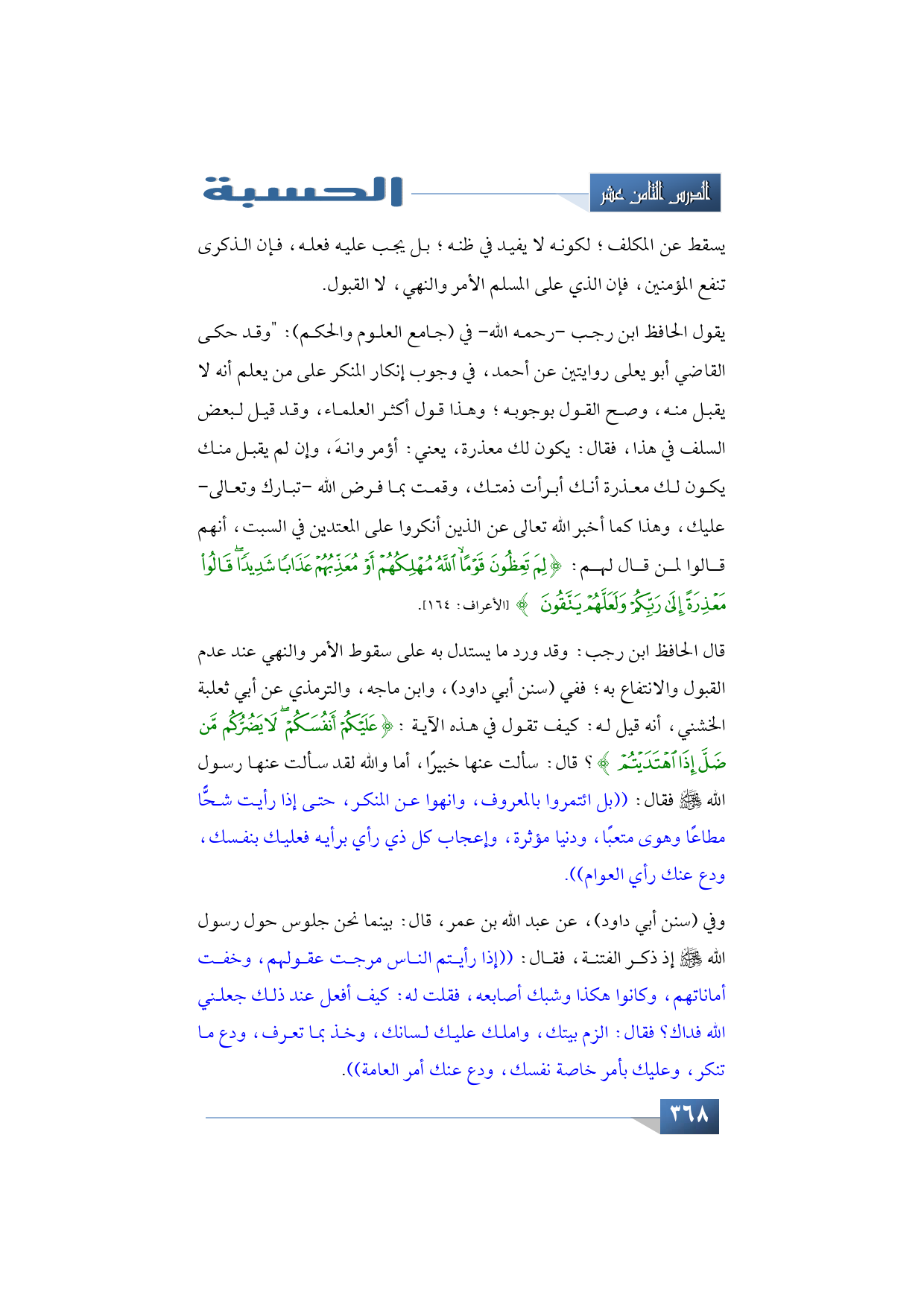 قال الحافظ ابن رجب: وقد ورد ما يستدل به على سقوط الأمر والنهي عند عدم القبول والانتفاع به، ففي (سنن أبي داود) وابن ماجه، والترمذي عن أبي ثعلبة الخشني أنه قيل له: كيف تقول في هذه الآية {عَلَيْكُمْ أَنفُسَكُمْ لاَ يَضُرُّكُم مَّن ضَلَّ إِذَا اهْتَدَيْتُمْ}؟ قال: سألت عنها خبيرًا، أما والله لقد سألت عنها رسول الله -صلى الله عليه وسلم- فقال: ((بل ائتمروا بالمعروف، وانهوا عن المنكر، حتى إذا رأيت شحًّا مطاعًا وهوى متعبًا، ودنيا مؤثرة، وإعجاب كل ذي رأي برأيه فعليك بنفسك ودع عنك رأي العوام)).