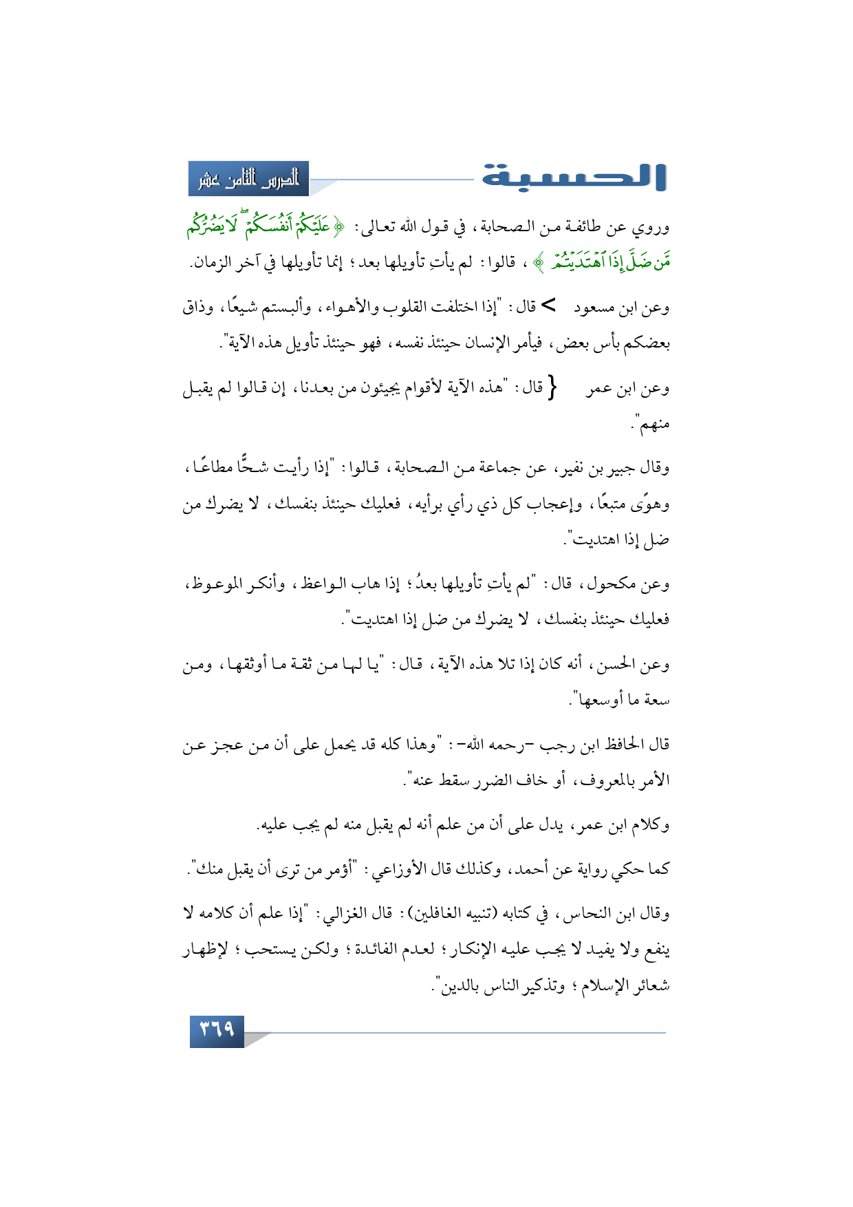 وقال جبير بن نفير عن جماعة من الصحابة قالوا: "إذا رأيت شحًّا مطاعًا وهوًى متبعًا، وإعجاب كل ذي رأي برأيه، فعليك حينئذ بنفسك لا يضرك من ضل إذا اهتديت".