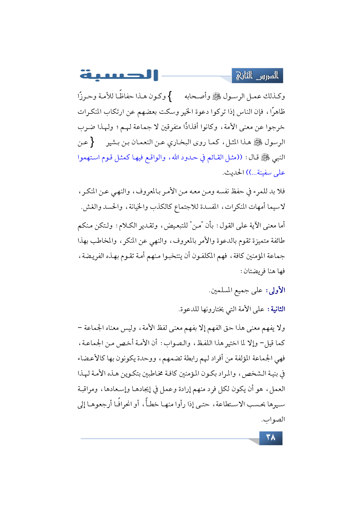 وكذلك عمل الرسول -صلى الله عليه وسلم- وأصحابه رضي الله عنهم، وكون هذا حفاظًا للأمة وحرزًا ظاهرًا، فإن الناس إذا تركوا دعوة الخير وسكت بعضهم لبعض عن ارتكاب المنكرات خرجوا عن معنى الأمة، وكانوا أفذاذا متفرقين لا جماعة لهم، ولهذا ضرب الرسول -صلى الله عليه وسلم- هذا المثل كما روى البخاري عن النعمان بن بشير -رضي الله عنهما- عن النبي -صلى الله عليه وسلم- قال: ((مثل القائم في حدود الله، والواقع فيها كمثل قوم استهموا على سفينة، فصار بعضهم أعلاها وبعضهم أسفلها، وكان الذين في أسفلها إذا استقوا من الماء مروا على من فوقهم، فقالوا: لو أنا خرقنا في نصيبنا خرقًا ولم نؤذ من فوقنا، فإن تركوهم وما أرادوا هلكوا جميعًا، وإن أخذوا على أيدهم نجوا ونجوا جميعًا)).