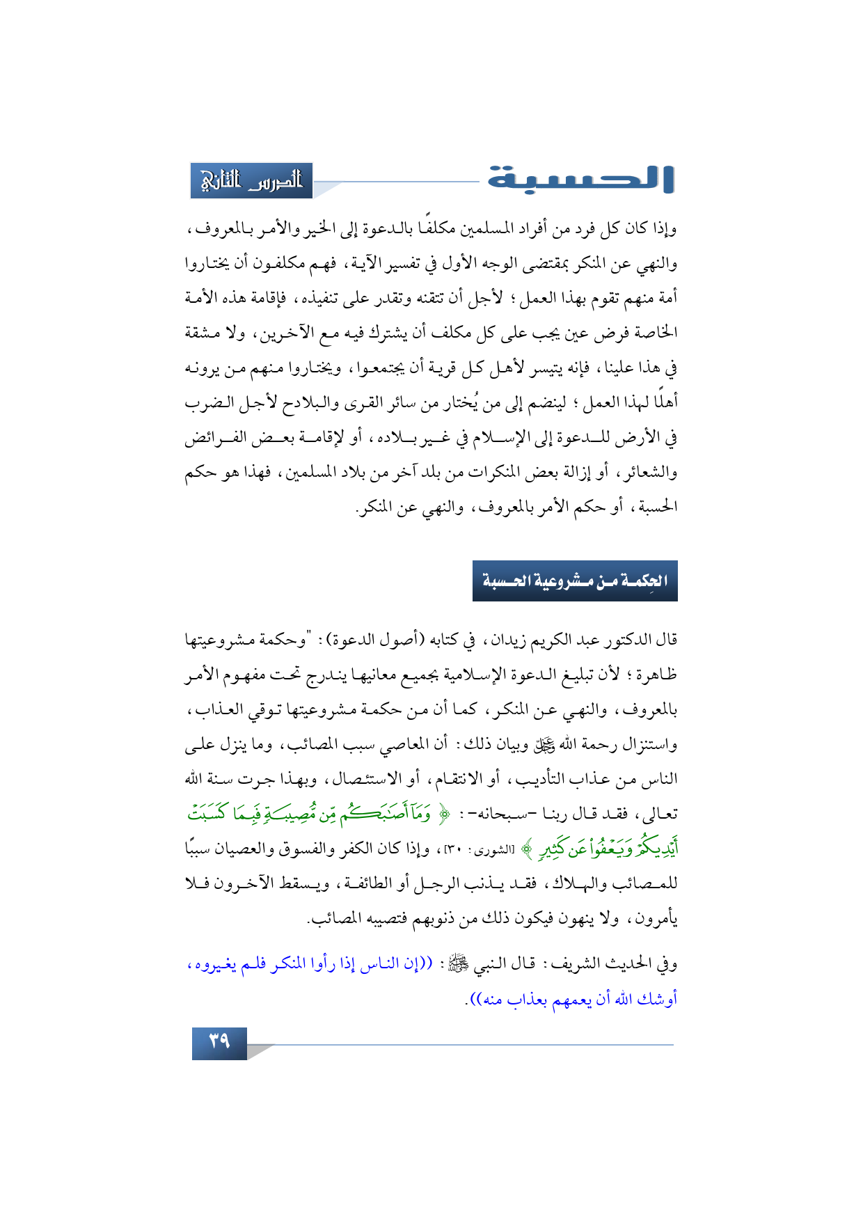 وإذا كان كل فرد من أفراد المسلمين مكلفًا بالدعوة إلى الخير والأمر بالمعروف، والنهي عن المنكر بمقتضى الوجه الأول في تفسير الآية، فهم مكلفون أن يختاروا أمة منهم تقوم بهذا العمل؛ لأجل أن تتقنه وتقدر على تنفيذه، فإقامة هذه الأمة الخاصة فرض عين يجب على كل مكلف أن يشترك فيه مع الآخرين، ولا مشقة في هذا علينا، فإنه يتيسر لأهل كل قرية أن يجتمعوا، ويختاروا منهم من يرونه أهلًا لهذا العمل؛ لينضم إلى من يختاره من سائر القرى والبلاد لأجل الضرب في الأرض للدعوة إلى الإسلام في غير بلادة، أو لإقامة بعض الفرائض والشعائر، أو إزالة بعض المنكرات من بلد آخر من بلاد المسلمين، فهذا هو حكم الحسبة أو حكم الأمر بالمعروف والنهي عن المنكر.