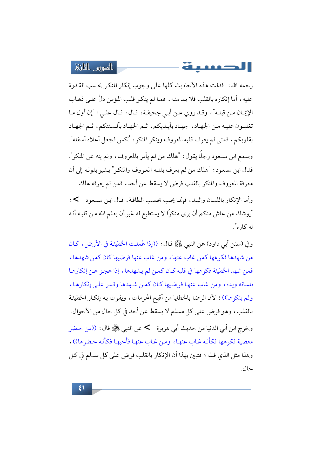 -رحمه الله-: "فدلت هذه الأحاديث كلها على وجوب إنكار المنكر بحسب القدرة عليه، أما إنكاره بالقلب فلا بد منه، فما لم ينكر قلب المؤمن دلَّ على ذهاب الإيمان من قبله"، وقد روي عن أبي جحيفة قال: قال علي: "إن أول ما تغلبون عليه من الجهاد جهاد بأيديكم، ثم الجهاد بألسنتكم، ثم الجهاد بقلوبكم، فمتى لم يعرف قلبه المعروف وينكر المنكر نُكس فجعل أعلاه أسفله".