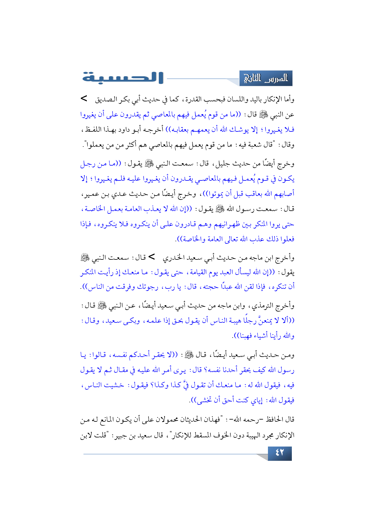 وأما الإنكار باليد واللسان فبحسب القدرة كما في حديث أبي بكر الصديق -رضي الله عنه- عن النبي -صلى الله عليه وآله وسلم- قال: ((ما من قوم يُعمل فيهم بالمعاصي ثم يقدرون على أن يغيروا فلا يغيروا؛ إلا يوشك الله أن يعمهم بعقابه)) أخرجه أبو داود بهذا اللفظ، وقال: "قال شعبة فيه: ما من قوم يعمل فيهم بالمعاصي هم أكثر من من يعملوا".