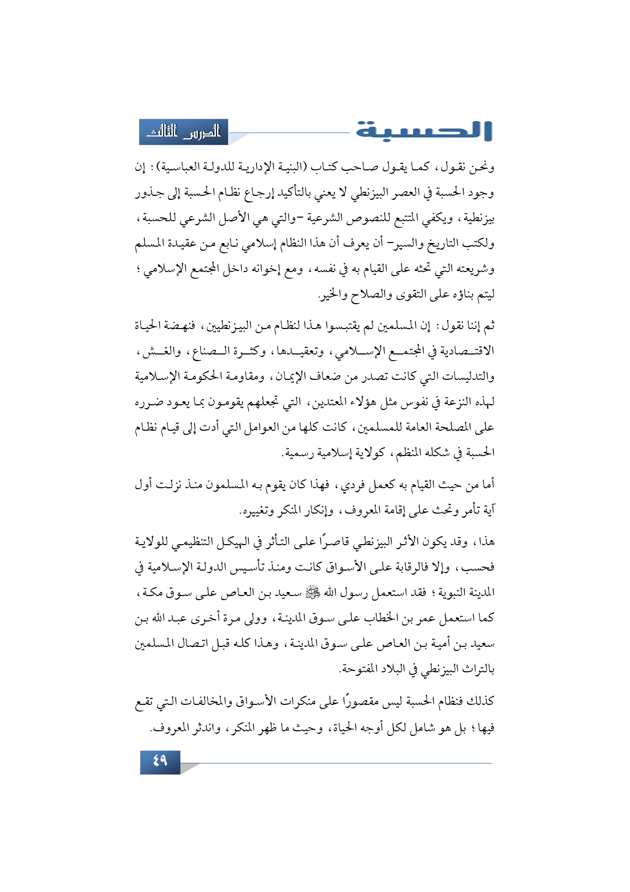 ونحن نقول كما يقول صاحب كتاب (البنية الإدارية للدولة العباسية): إن وجود الحسبة في العصر البيزنطي لا يعني بالتأكيد إرجاع نظام الحسبة إلى جذور بيزنطية، ويكفي المتتبع للنصوص الشرعية -والتي هي الأصل الشرعي للحسبة، ولكتب التاريخ والسير- أن يعرف أن هذا النظام إسلامي نابع من عقيدة المسلم وشريعته التي تحثه على القيام به في نفسه ومع إخوانه داخل المجتمع الإسلامي؛ ليتم بناؤه على التقوى والصلاح والخير.