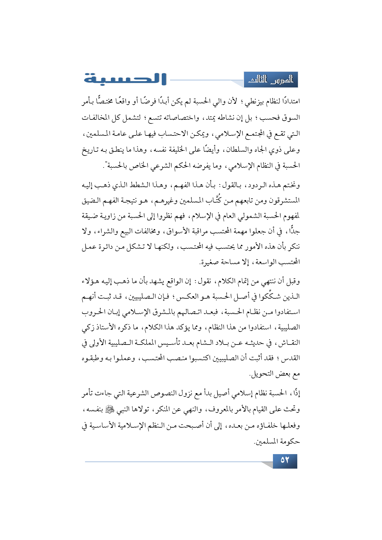 امتدادًا لنظام بيزنطي؛ لأن والي الحسبة لم يكن أبدًا فرضًا أو واقعًا مختصًّا بأمر السوق فحسب، بل إن نشاطه يمتد، واختصاصاته تتسع لتشمل كل المخالفات التي تقع في المجتمع الإسلامي، ويمكن الاحتساب فيها على عامة المسلمين، وعلى ذوي الجاه والسلطان، وأيضًا على الخليفة نفسه، وهذا ما ينطق به تاريخ الحسبة في النظام الإسلامي، وما يفرضه الحكم الشرعي الخاص بالحسبة".