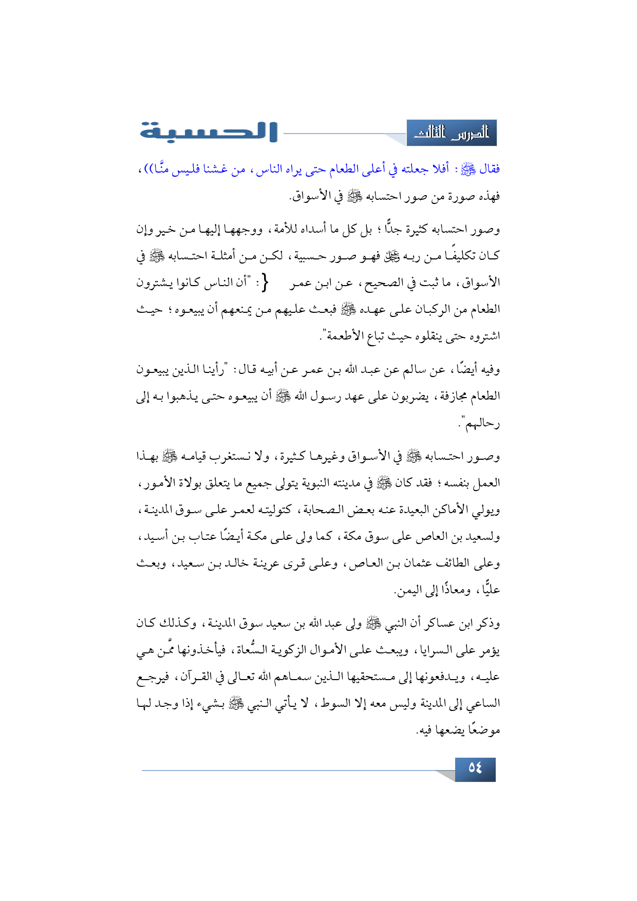 فقال -عليه الصلاة والسلام-: أفلا جعلته في أعلى الطعام حتى يراه الناس، من غشنا فليس منَّا))، فهذه صورة من صور احتسابه -صلى الله عليه وسلم- في الأسواق.