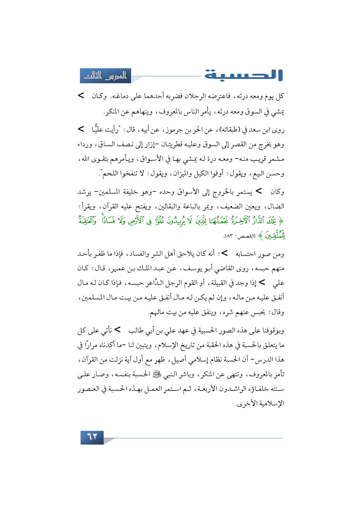وبوقوفنا على هذه الصور الحسبية في عهد علي بن أبي طالب -رضي الله عنه- نأتي على كل ما يتعلق بالحسبة في هذه الحقبة من تاريخ الإسلام، ويتبين لنا ما أكدناه مرارًا في هذا الدرس أن الحسبة نظام إسلامي أصيل ظهر مع أول آية نزلت من القرآن تأمر بالمعروف وتنهى عن المنكر، وباشر النبي -صلى الله عليه وسل م- الحسبة بنفسه، وصار على سنته خلفاؤه الراشدون الأربعة، ثم استمر العمل بهذه الحسبة في العصور الإسلامية الأخرى.