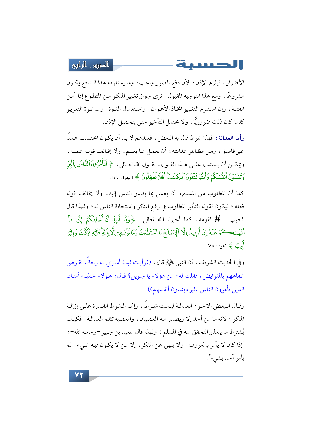 وأما العدالة، فهذا شرط قال به البعض، فعندهم لا بد أن يكون المحتسب عدلًا غير فاسق، ومن مظاهر عدالته أن يعمل بما يعلم، ولا يخالف قوله عمله، ويمكن أن يستدل بهذا القول بقول الله تعالى: {أَتَأْمُرُونَ النَّاسَ بِالْبِرِّ وَتَنْسَوْنَ أَنْفُسَكُمْ وَأَنْتُمْ تَتْلُونَ الْكِتَابَ أَفَلَا تَعْقِلُونَ} (البقرة: 44).