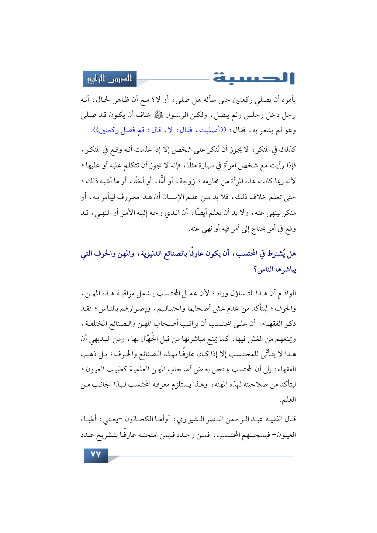وهل يُشترط في المحتسب أن يكون عارفًا بالصنائع الدنيوية والمهن والحرف التي يباشرها الناس؟ الواقع أن هذا التساؤل وراد؛ لأن عمل المحتسب يشمل مراقبة هذه المهن، والحرف ليتأكد من عدم غش أصحابها واحتيالهم، وإضرارهم بالناس؛ فقد ذكر الفقهاء أن على المحتسب أن يراقب أصحاب المهن والصنائع المختلفة، ويمنعهم من الغش فيها، كما يمنع مباشرتها من قبل الجُهَّال بها، ومن البديهي أن هذا لا يتأتَّى للمحتسب إلا إذا كان عارفًا بهذه الصنائع والحرف؛ بل ذهب الفقهاء إلى أن المحتسب يمتحن بعض أصحاب المهن العلمية كطبيب العيون، ليتأكد من صلاحيته لهذه المهنة، وهذا يستلزم معرفة المحتسب لهذا الجانب من العلم.