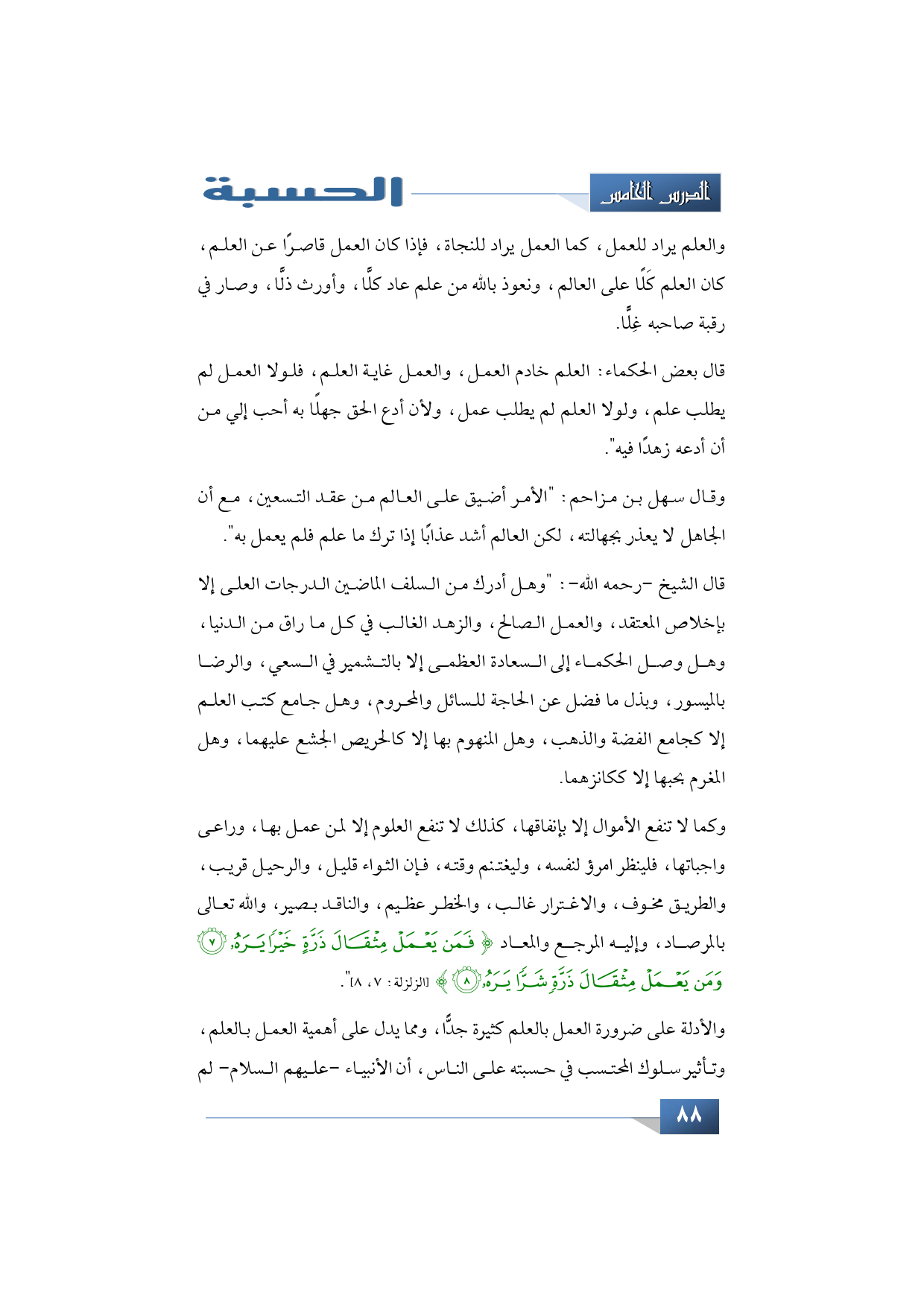 قال الشيخ -رحمه الله-: وهل أدرك من السلف الماضين الدرجات العلى إلا بإخلاص المعتقد، والعمل الصالح، والزهد الغالب في كل ما راق من الدنيا؟ وهل وصل الحكماء إلى السعادة العظمى إلا بالتشمير في السعي والرضا بالميسور، وبذل ما فضل عن الحاجة للسائل والمحروم؟ وهل جامع كتب العلم إلا كجامع الفضة والذهب؟ وهل المنهوم بها إلا كالحريص الجشع عليهما؟ وهل المغرم بحبها إلا ككانزهما؟