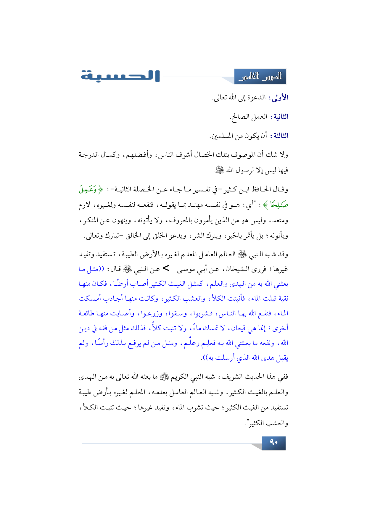 وقال الحافظ ابن كثير في تفسير ما جاء عن الخصلة الثانية: {وَعَمِلَ صَالِحًا}: "أي هو في نفسه مهتد بما يقوله، فنفعه لنفسه ولغيره، لازم ومتعد، وليس هو من الذين يأمرون بالمعروف، ولا يأتونه، وينهون عن المنكر، ويأتونه، بل يأتمر بالخير، ويترك الشر، ويدعو الخلق إلى الخالق -تبارك وتعالى.