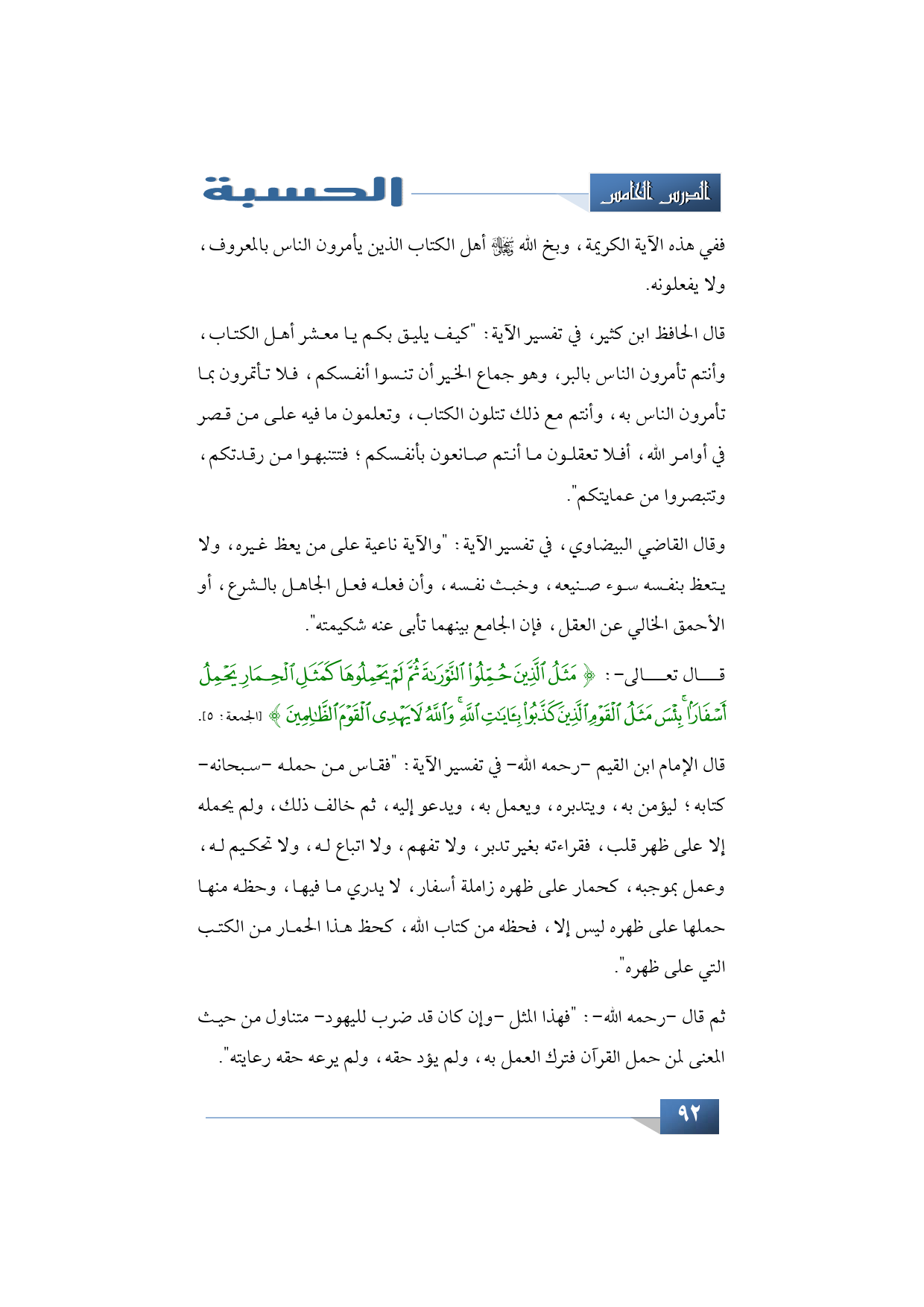 ففي هذه الآية الكريمة وبخ الله -سبحانه وتعالى- أهل الكتاب الذين يأمرون الناس بالمعروف، ولا يفعلونه. قال الحافظ ابن كثير في تفسير الآية: "كيف يليق بكم يا معشر أهل الكتاب، وأنتم تأمرون الناس بالبر، وهو جماع الخير أن تنسوا أنفسكم، فلا تأتمرون بما تأمرون الناس به، وأنتم مع ذلك تتلون الكتاب، وتعلمون ما فيه على من قصر في أوامر الله، أفلا تعقلون ما أنتم صانعون بأنفسكم؛ فتتنبهوا من رقدتكم، وتتبصروا من عمايتكم".
